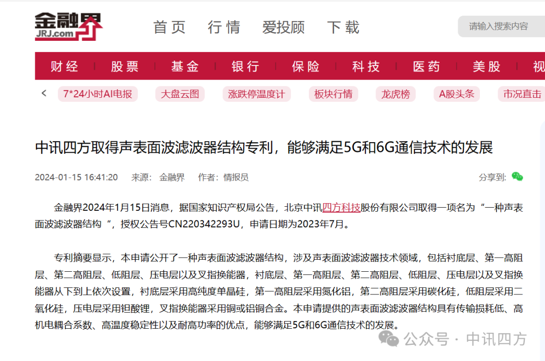 我会副会长单位中讯四方公司取得一项声表面波滤波器结构专利,能够满足5G和6G通信技术的发展