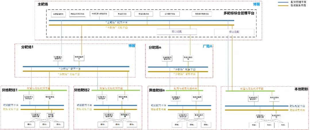 对于本地靶标,分布式靶标管理系统直接适配靶标厂商提供的配置和采集接口,进行直接的管理。对于异地靶标,可以通过异地的分靶场系统实现对靶标的代管,根据异地靶场的建设情况可分为两种情况:如果异地靶场系统为博智建设,分布式靶标管理系统可无缝对接分靶场系统;如果异地靶场系统为其他厂家建设,需根据厂家提供的接口适配后做对接。分布式靶标管理系统对靶标的管理可分为配置管理和数据采集两个平面,配置管理平面主要用于配置和采集指令的下发、基础数据的查询,可靠性要求高;数据采集平面主要用于对靶标节点和流量数据的采集和汇聚,对网络的带宽有较大的需求。博智分布式靶标管理系统不仅是对靶场管理挑战的回应,更是对分布式靶场发展需求的前瞻布局。它通过统一的管理界面,不仅简化了多厂家、多型号靶标的复杂配置,更通过数据与配置的标准化接口,实现靶场间资源的协同与场景的灵活构建,为跨地域的综合性演练提供了坚实基础、有利支撑。