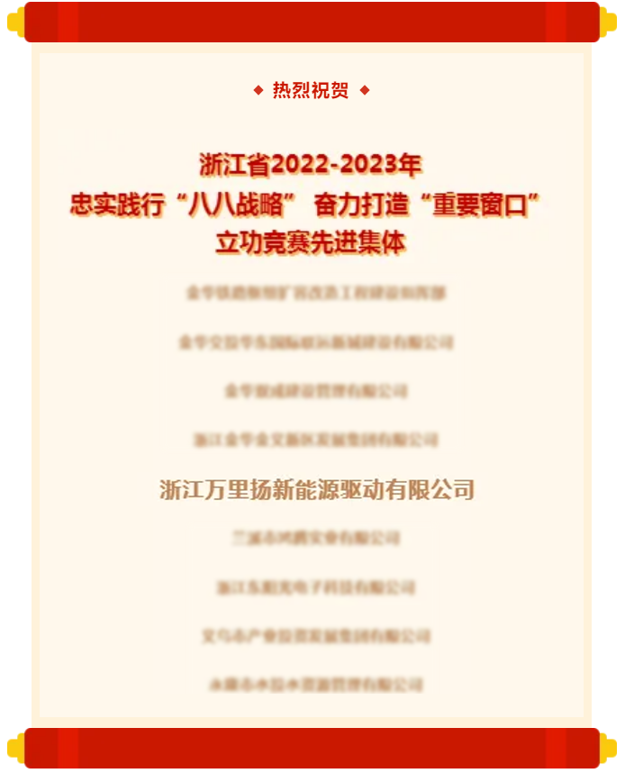 近年来,浙江万里扬新能源驱动有限公司深入贯彻落实省委省政府决策部署,围绕国家和省重大战略、重大工程、重大项目、重点产业、重大活动深入开展立功竞赛活动,落细落实“八比八赛”各项内容,坚持对标一流、聚力攻坚克难,切实发挥立功竞赛“新引擎”和“助推器”作用,积极打造新质生产力,实现企业高质量发展,在忠实践行“八八战略”奋力打造“重要窗口”中交出万里扬高分答卷。