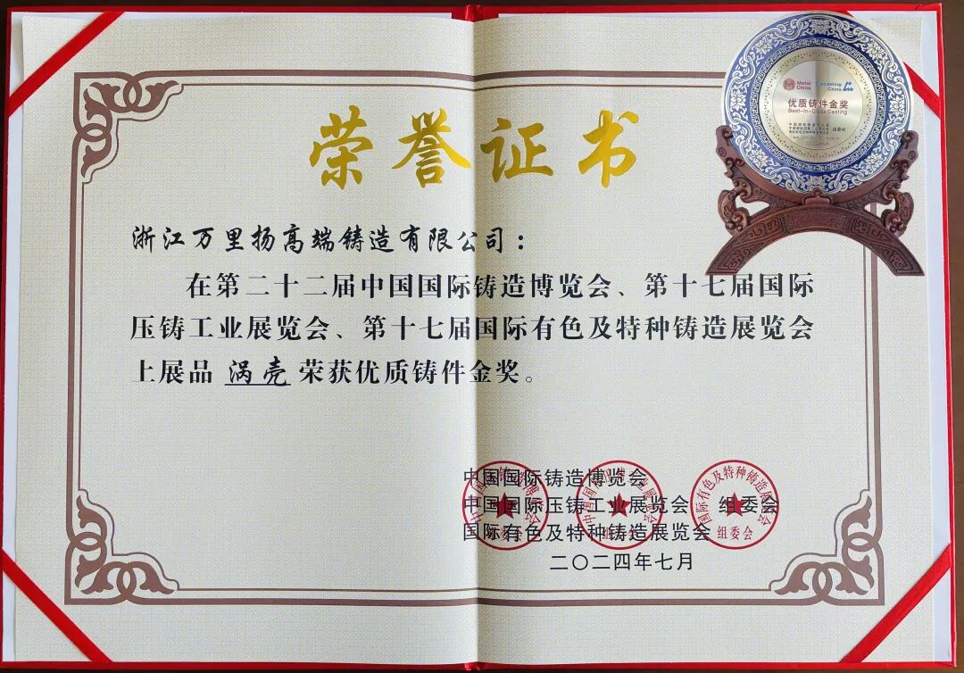 近日,第二十二届中国国际铸造博览会在国家会展中心(上海)召开。会上,由我会理事单位浙江万里扬公司的全资子公司浙江万里扬高端铸造有限公司(以下简称“高端铸造公司”)开发的产品“涡壳”荣获“优质铸件金奖”,这也是万里扬产品第二次荣膺该项荣誉。