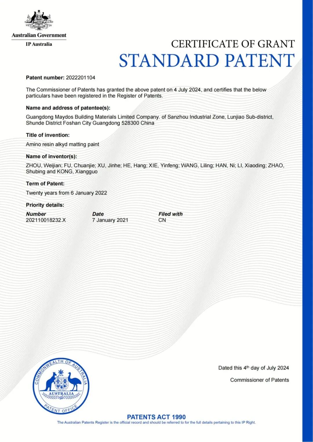 2024 年 7 月 4 日,我会理事单位广东美涂士建材股份有限公司申请的发明专利“氨基树脂醇酸消光漆”在澳大利亚获得授权。