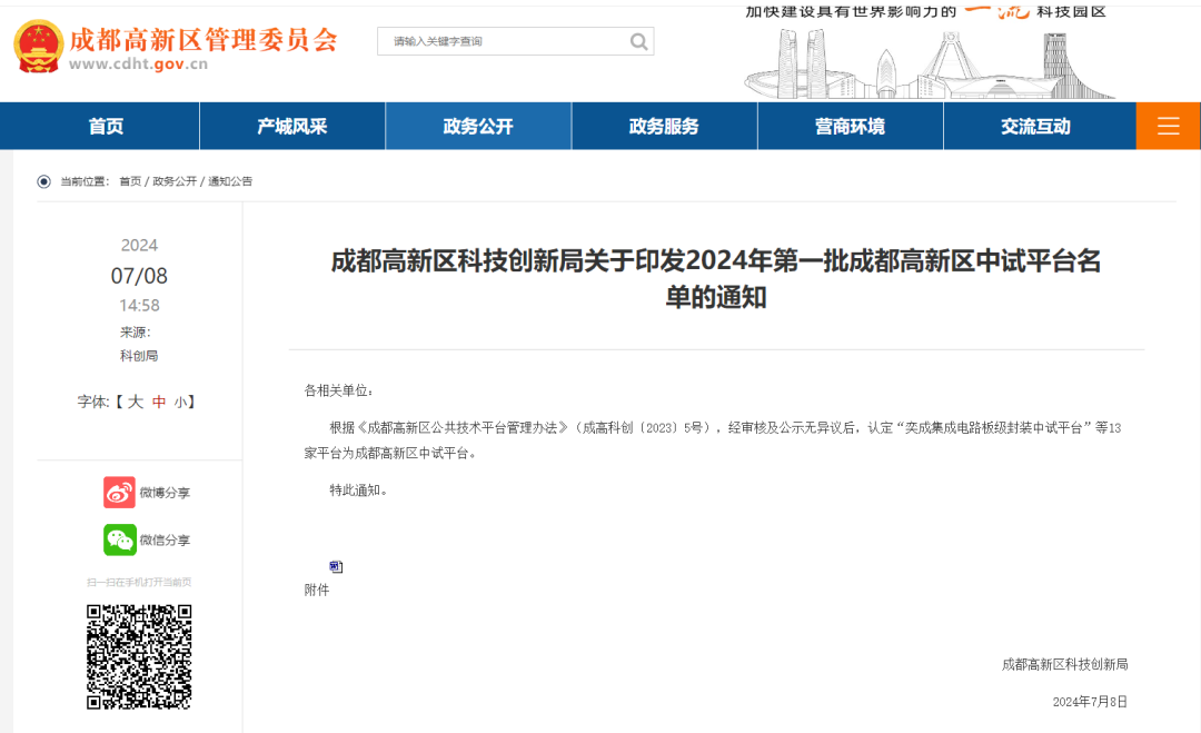 近日,成都高新区科技创新局发布了关于2024年第一批成都高新区中试平台名单,我会理事单位成都瑞迪威公司打造的“成都高新区射频微系统中试平台”成功入选。