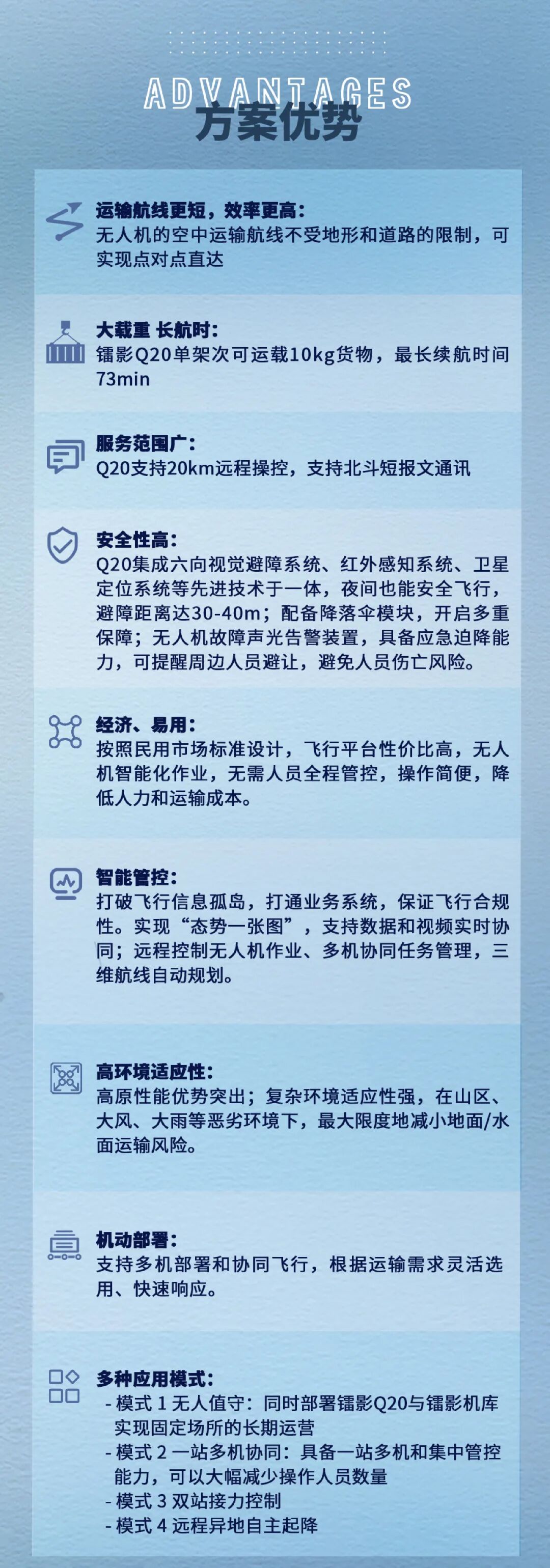 联合飞机城市物流解决方案致力于在低空物流配送领域实现创新与突破,专注解决末端配送的难题,补齐现有物流运输短板,应对特殊或复杂环境下的物流挑战,实现常态化和非常态化物流运输业务结合。联合飞机在国内多个省市开展创新应用,运营平台“联飞快送”的试点应用和创新Q20物流无人机的服务模式,不仅在国内遍地开花,更在全球城市物流运输行业变革中,对解决偏远地区、最后一公里、紧急物资等场景需求具有重要意义。