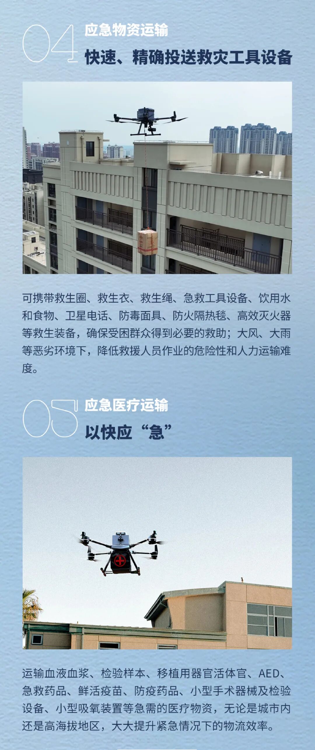 紧急救援和医疗用品运输领域,也是联合飞机重点拓展的物流配送场景。从南山医院到市血液中心,地面交通运输90~120min,Q20配送最快15分钟,节省近80%的时间,这条路,Q20已经安全运输30000+架次,飞行3000+公里。黄山暴雨洪涝灾害发生后,道路受损严重,救援物资靠人力运输难度大,危险性高,Q20携带救生装备沿河道飞行,搜寻落水人员,提供救生装备;跨越湍急河流,Q20空中运输光纤引导绳,为维修人员提供抢修设备。