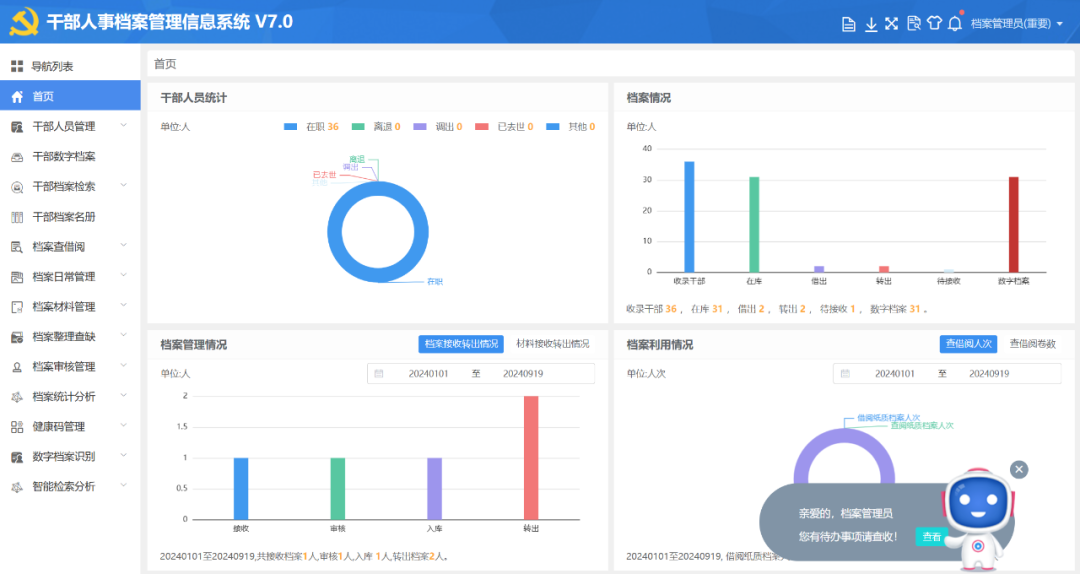 干部人事档案管理信息系统以《干部人事档案工作条例》为根本依据,围绕《条例》明确的档案采集、日常管理、档案利用三项核心工作的信息化建设为出发点,按照“提升采集效率、强化日常管理、创新档案利用”的研发思路,实现精准高效审核档案的同时,推动档案日常管理的高效运转,促进档案信息的科学利用,从而更好地为精准科学选人用人、从严监督管理干部服务,实现网络化、信息化和智能化发展。
