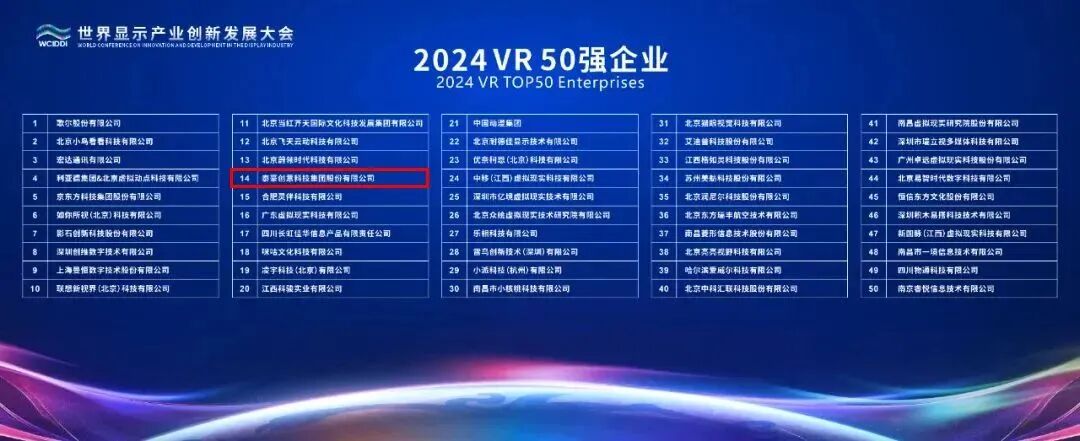 近日,“2024VR50强企业”名单正式发布,我会会长单位泰豪基于多年深耕VR产业的深厚实力再度荣登榜单,连续六年获评VR50强企业。