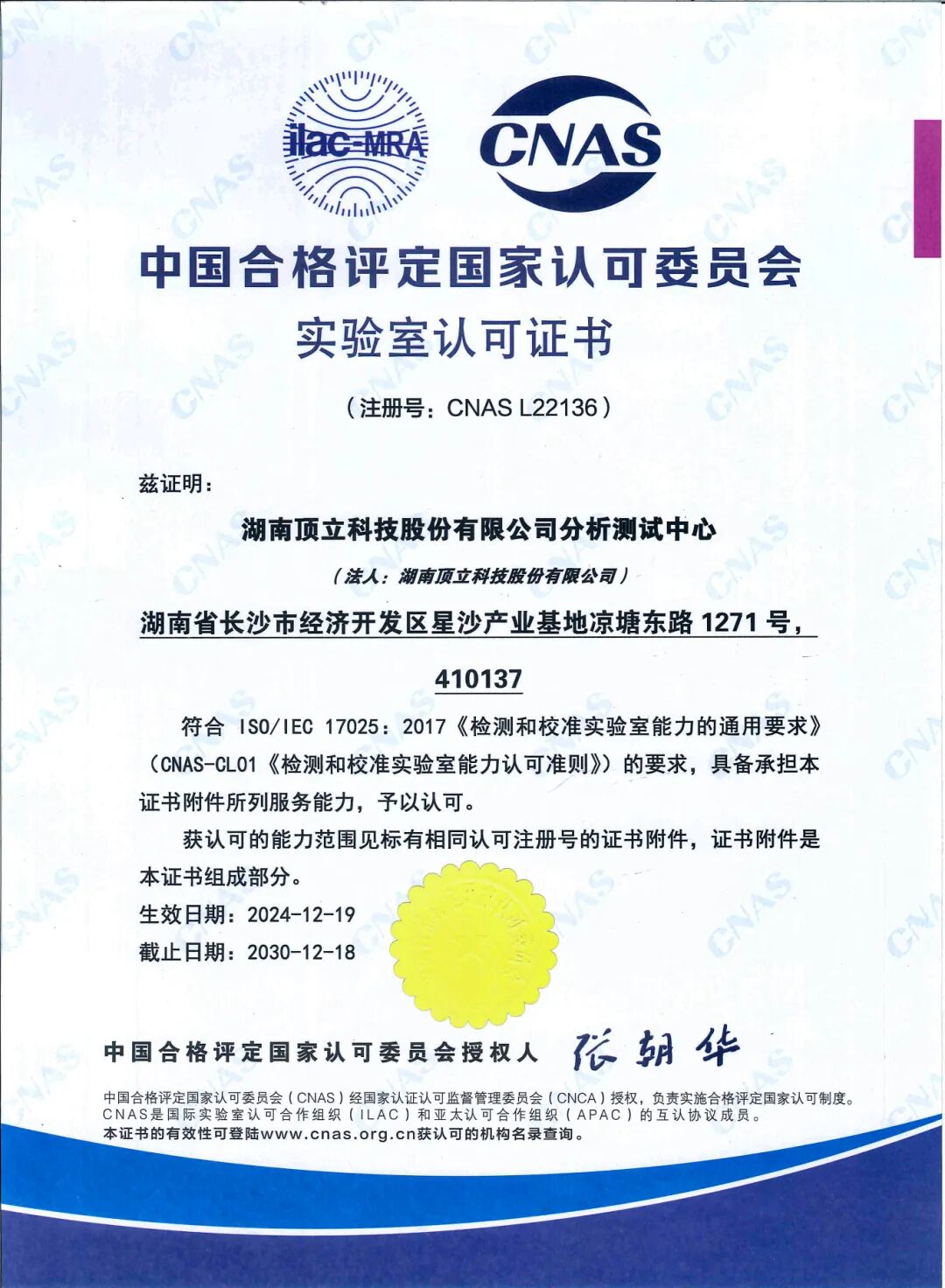 我会常务会长单位湖南顶立科技公司分析测试中心获得CNAS认证