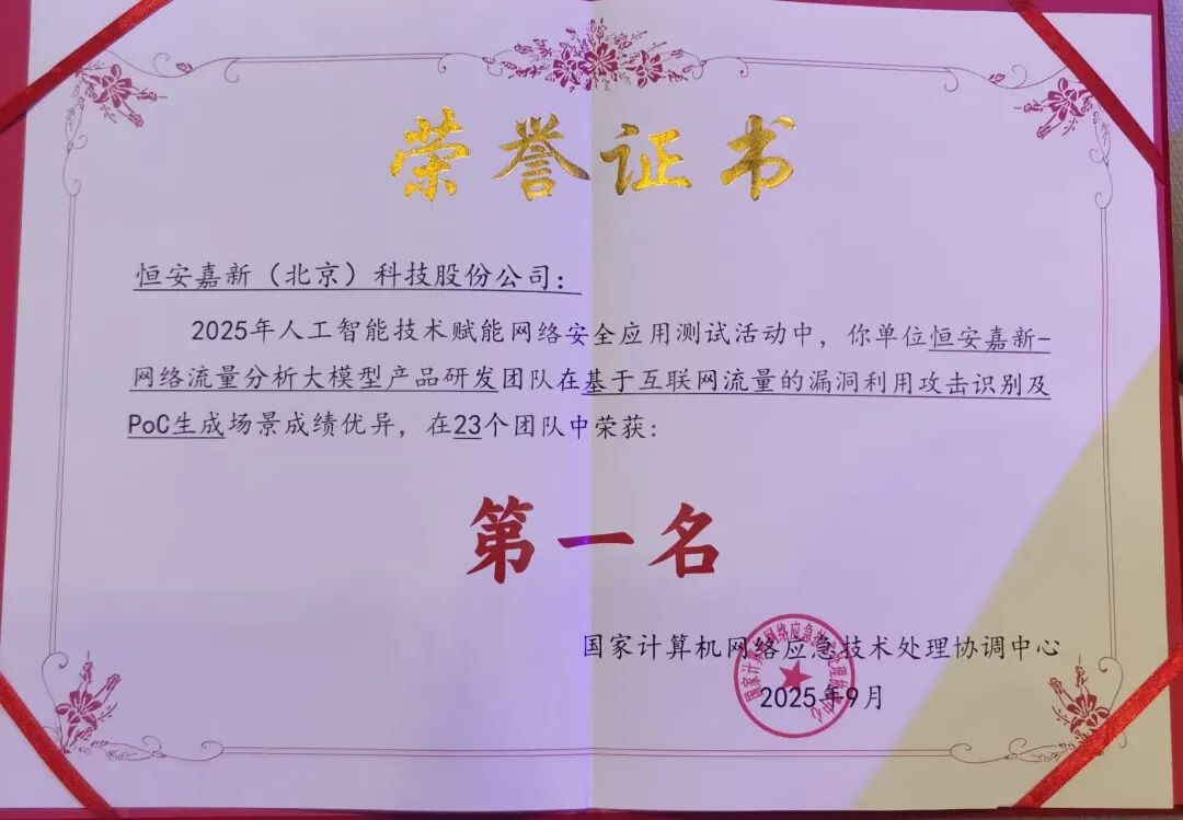 这份荣誉不仅是对恒安嘉新技术实力的肯定,也是对公司与中央网信办、国家互联网应急中心,以及相关单位深度合作的肯定。公司凭借在人工智能安全领域的厚度积累,将继续加大研发投入,不断完善人工智能安全产品及服务,为国家网络安全事业持续贡献恒安嘉新力量!