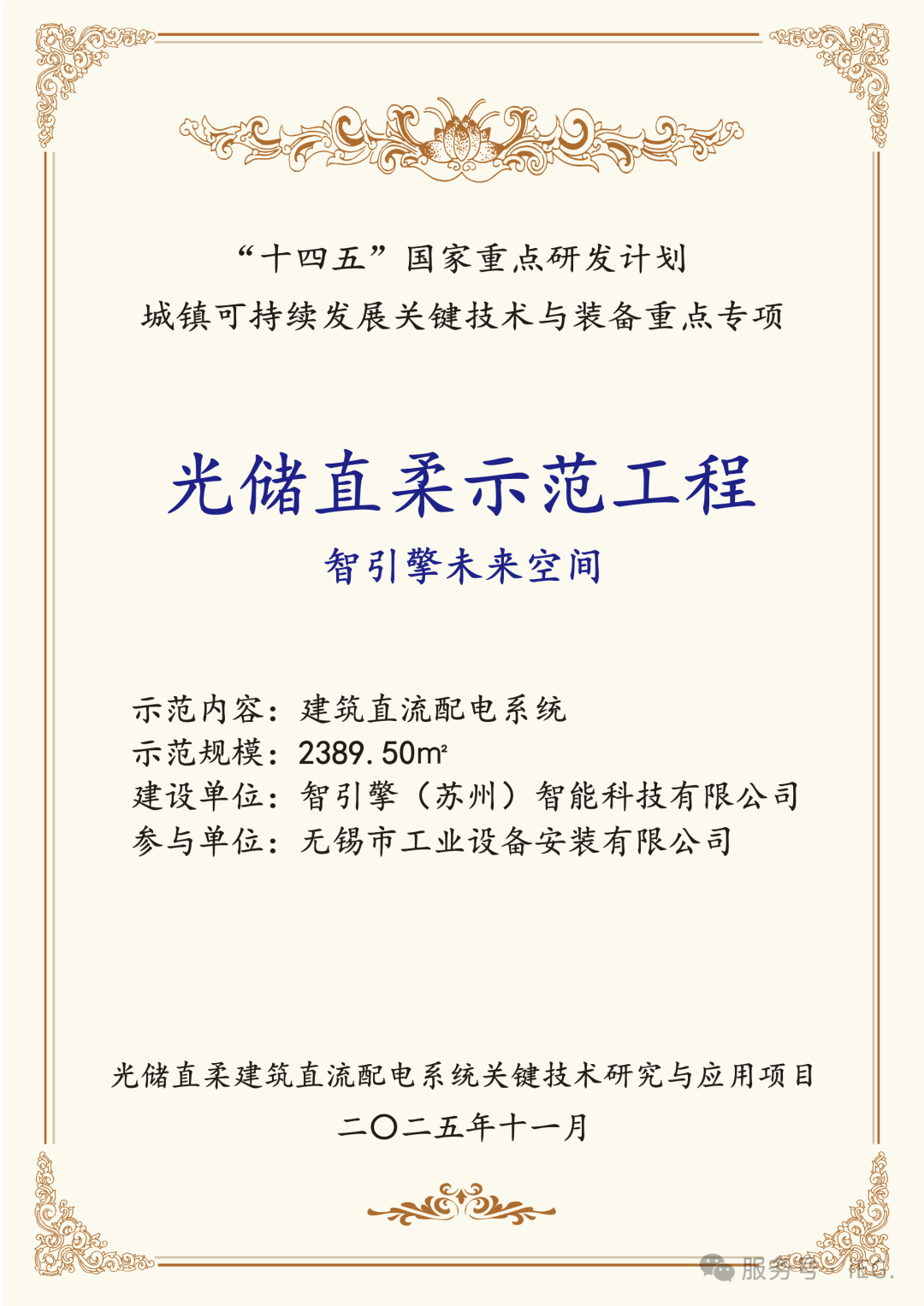 苏州,2025年12月——近日,智引擎(苏州)智能科技有限公司(以下简称“智引擎”)牵头建设的“智引擎未来空间”示范工程,正式获批成为“十四五”国家重点研发计划“光储直柔建筑直流配电系统关键技术研究与应用(2023YFC3807000)”项目示范工程。