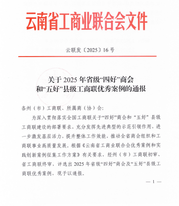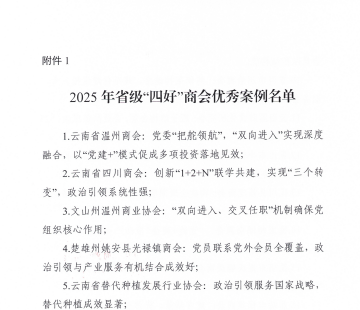 日前,云南省工商业联合会发布《关于2025年省级“四好”商会和“五好”县级工商联优秀案例的通报》(云联发〔2025〕16号),云南省温州商会凭借党委“把舵领航”、“双向进入”实现深度融合,以及“党建+”模式促成多项投资落地见效等突出成效,成功入选2025年省级“四好”商会优秀案例名单。