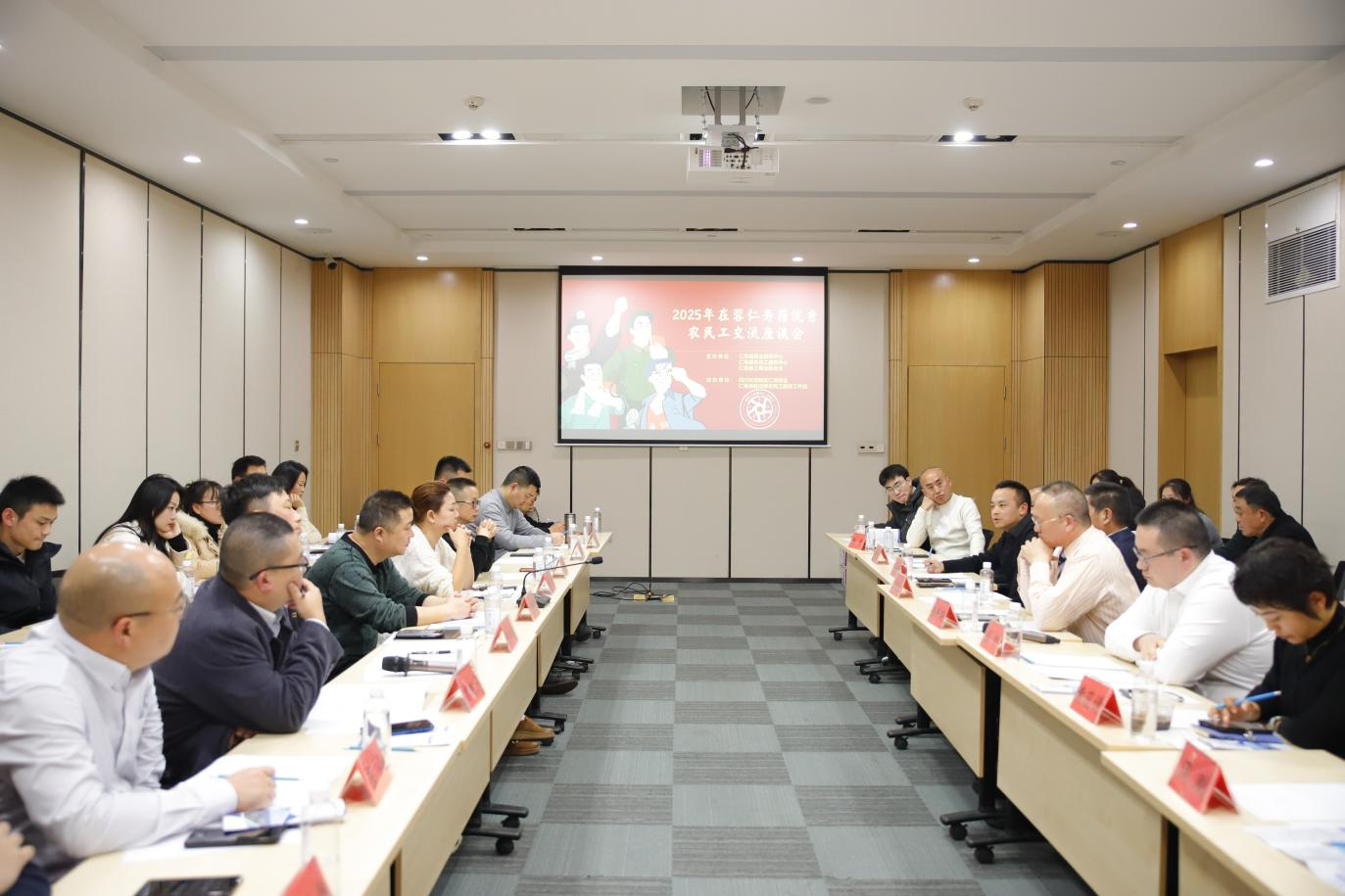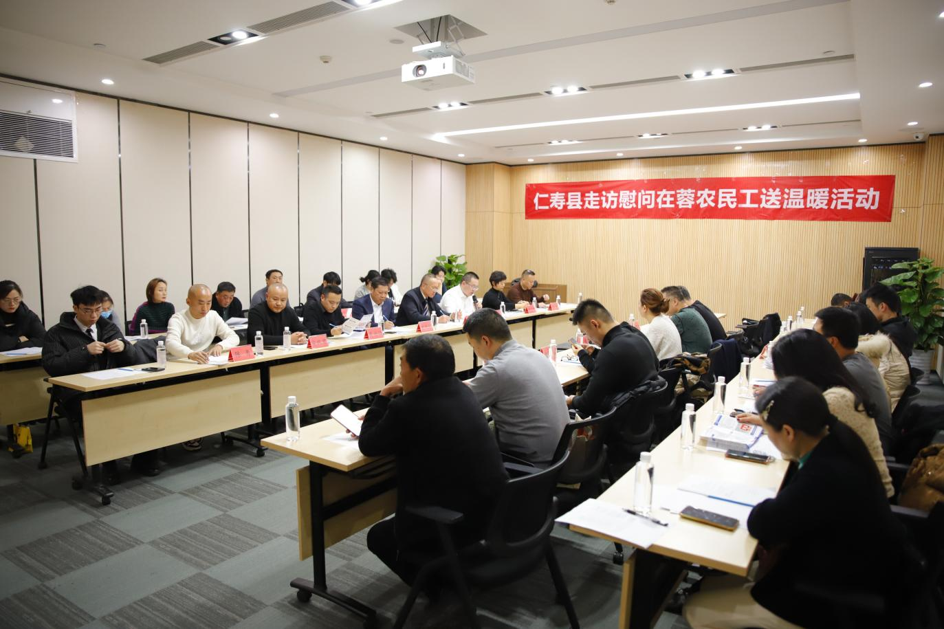 为深化区域劳务协作机制,拓宽仁寿县劳动力资源就业路径,提升农民工服务保障水平,推动实现更高质量与更充分就业, 12 月 10 日 下午,仁寿县在蓉农民工座谈交流会在成都市人力资源服务产业园4楼3号会议室举行。本次会议由仁寿县就业服务中心、仁寿县农民工服务中心、仁寿县工商联、仁寿农商银行与仁寿县驻成都农民工服务工作站联合举办,四川天府新区仁寿商会(以下简称 “天府仁寿商会”)作为核心参与方,组织多位优秀企业家代表和在蓉仁寿籍农民工代表参加,共话农民工就业创业服务保障工作,聆听农民工朋友的心声。