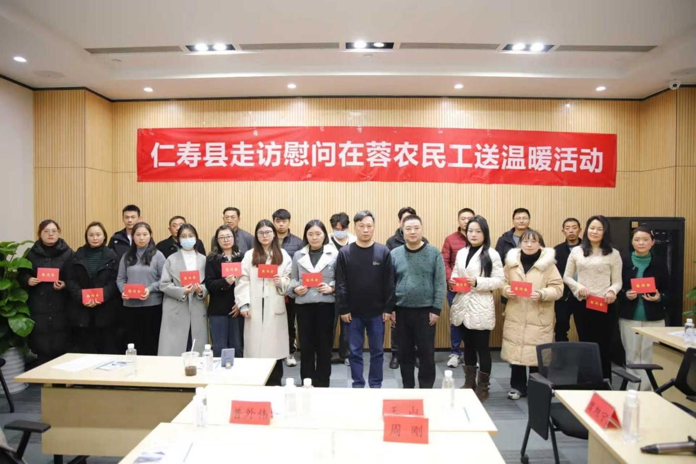 会议最后,仁寿县就业服务中心主任魏绍辉和农民工服务中心主任汪本高代表县委县政府对 20 名在蓉仁寿籍优秀农民工代表进行了现场慰问,为他们送上了慰问红包与诚挚的关怀,感谢他们为城市发展与家乡建设中所作出的贡献。受慰问的农民工代表们纷纷表示,此次座谈会让他们感受到了家乡党委政府与商会的双重关怀,未来将继续立足岗位、勤勉奋斗,同时也会持续关注家乡发展,为家乡建设贡献自己的一份力量。