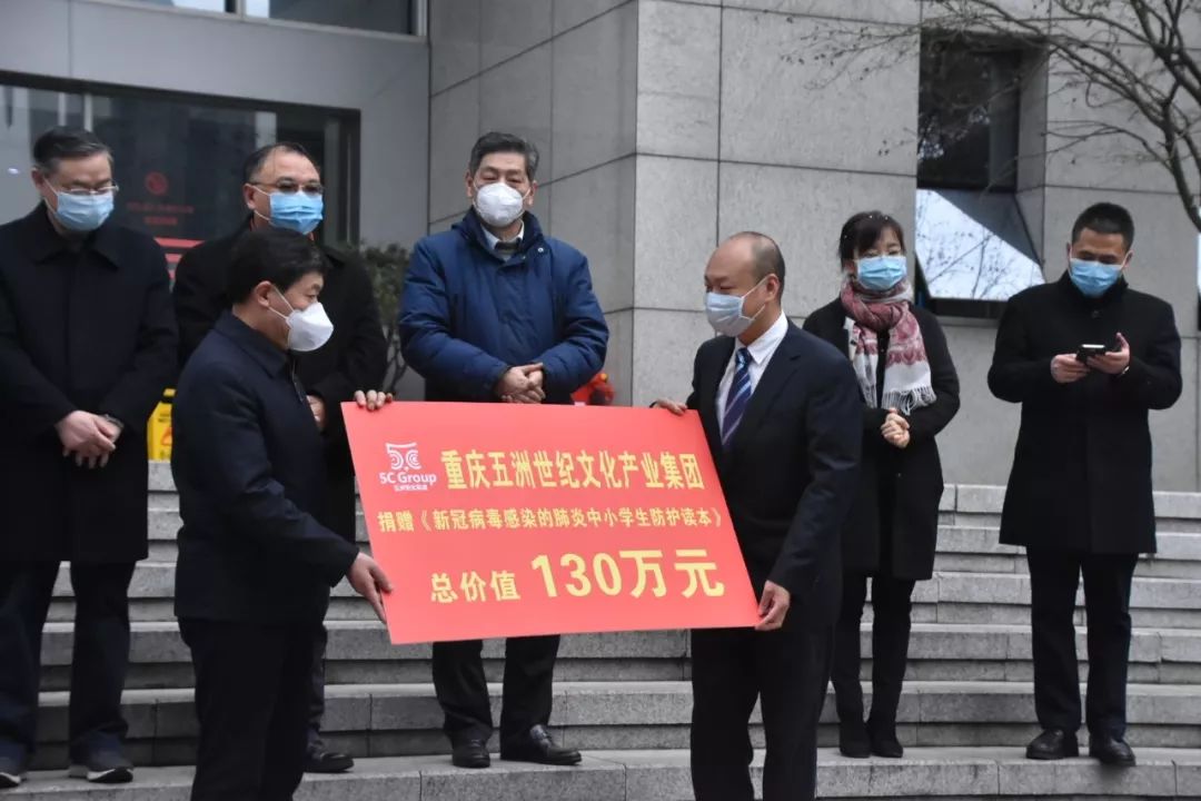 本着强烈的家国情怀和高度的社会责任感,五洲世纪集团在第一时间成立由集团董事长徐登权担任组长的抗疫领导工作小组并积极行动起来,踊跃为抗击疫情捐款捐物。此次共向重庆市九龙坡区小学、初中、高中学生人手捐赠一册《新型冠状病毒感染的肺炎学生防护读本》,约137000册共计价值130万元;医用口罩15000只、护目镜200个、手套5000只、医用酒精500桶、医用消毒液100桶,共计价值20万元;菜籽油800桶、东北大米500件,共计价值20万元;现金30万元。