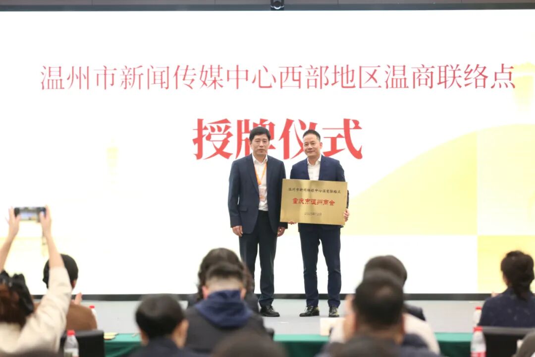 我会成为温州市新闻传媒中心西部地区温商联络点,会长谢庆好(右一)代表商会上台领取牌匾。