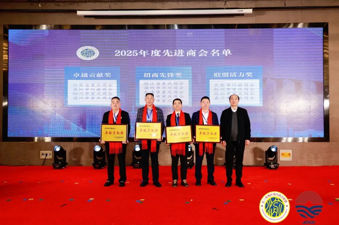 12月12日,冬日的南京暖意融融,曼舍·紫荆花大酒店内宾朋满座、乡情浓郁。以“渝商同心 渝见未来”为主题的2025年长三角地区重庆商会联盟会议在此隆重举行,来自长三角各地的重庆商会代表齐聚一堂,共叙乡谊、共商发展、共话未来。我会凭借在区域经济协作、渝商资源凝聚等方面的突出表现,荣获“卓越贡献奖”。