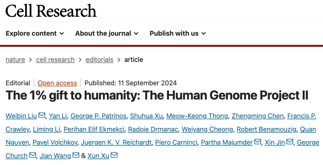 2024年9月,由华大组织发起,来自14个国家的科学家在国际知名学术期刊《细胞研究》(Cell Research)上以社论方式发表了人类基因组计划二期(HGP2)倡议文章。此次投稿入选获得了来自全球60余个国家的科学家署名支持。该计划秉承“让每个人都能从基因组科学中受益”的愿景,致力于构建一个开放、可信、公平共享的全球基因组科学体系。
