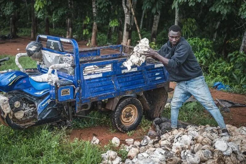 清晨时分,在科特迪瓦圣佩德罗省大贝雷比镇,一辆辆满载着乳白杯胶的三轮车在橡胶林间穿梭,源源不断驶入一座崭新的工厂。磅秤前,种植户们仔细比对着杯胶重量,空气中飘荡着橡胶特有的气味和人们欢快的交流声。