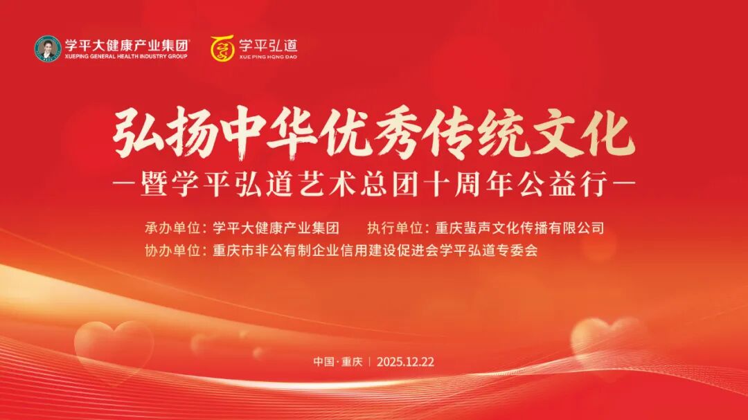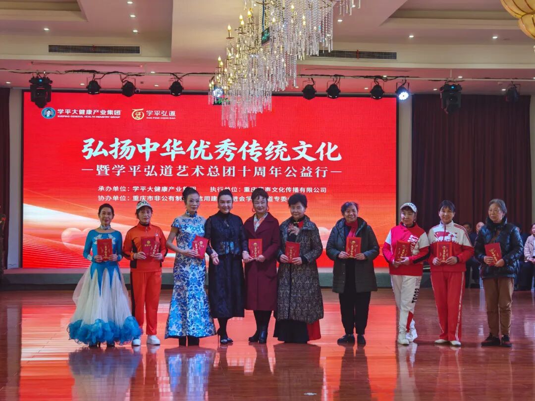 12月22日上午,由学平大健康产业集团承办的“弘扬中华优秀传统文化暨学平弘道艺术总团十周年公益行”活动温情启幕。作为活动协办方,重庆市非公有制企业信用建设促进会全程见证了这场以爱为核、以艺为媒的公益盛会,更目睹了彭学平会长深耕十年、情系老年群体的责任与担当。