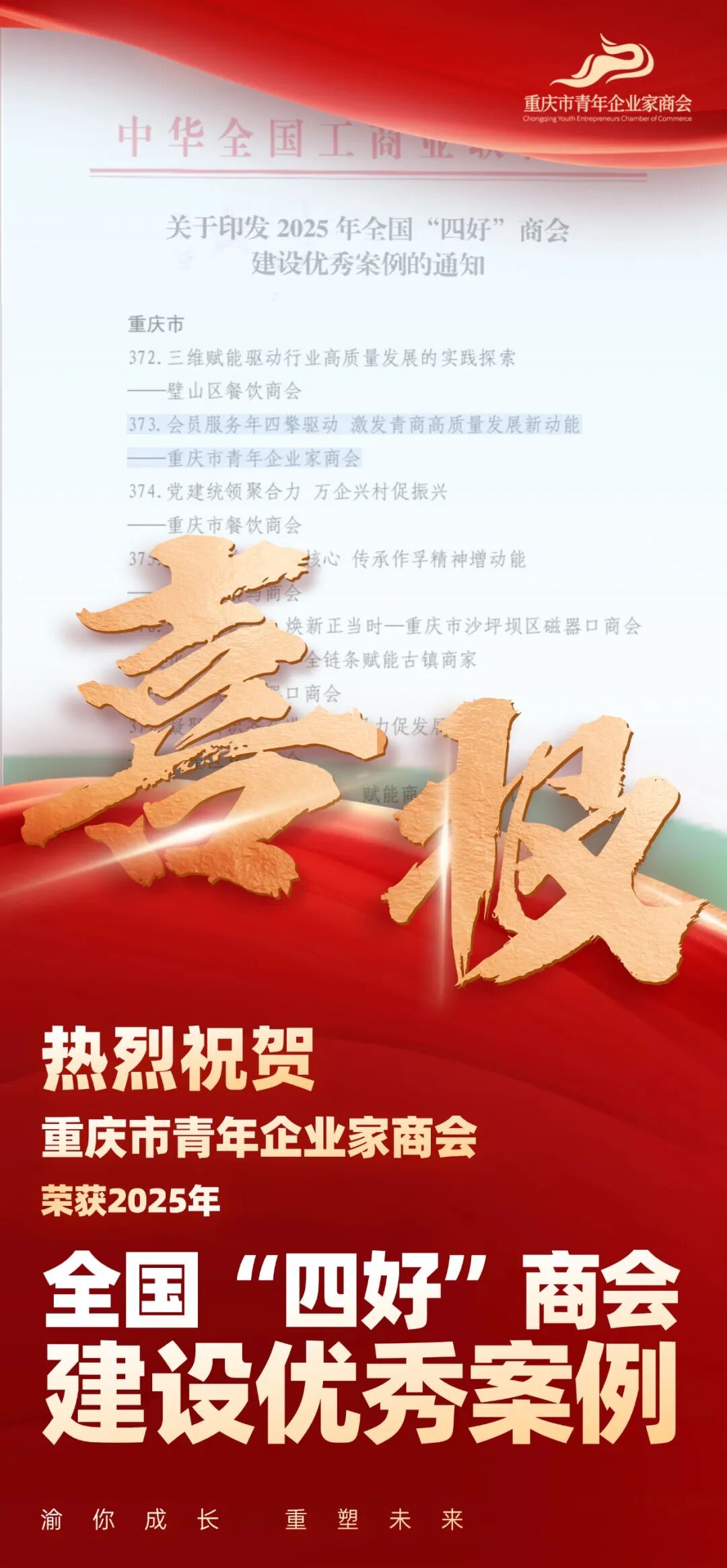 近日,全国工商联印发《2025年全国“四好”商会建设优秀案例的通知》,重庆市青年企业家商会凭借在“政治引领好、队伍建设好、服务发展好、自律规范好”方面的扎实建设和创新实践,成功荣获2025年全国“四好”商会建设优秀案例,成为全国商会组织改革发展的优秀典范。