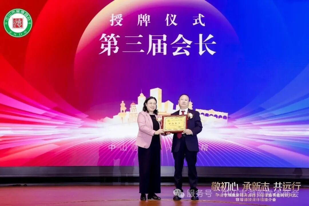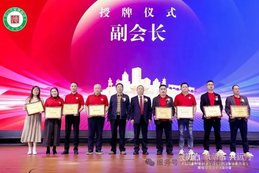 中山市政协副主席徐小莉等领导嘉宾依次登台,为第三届理监事会班子成员授牌。从会长、永久荣誉会长、商会顾问、监事长到执行会长、秘书长、名誉会长,从副会长、理事到监事、专职执行秘书长,一枚枚熠熠生辉的牌匾,既是荣耀的象征,更是沉甸甸的责任。现场掌声如潮,共同见证新一届领导班子的荣耀启航。
