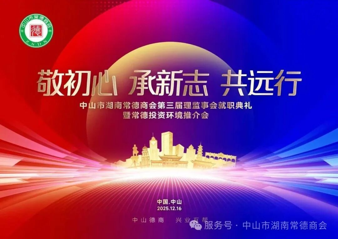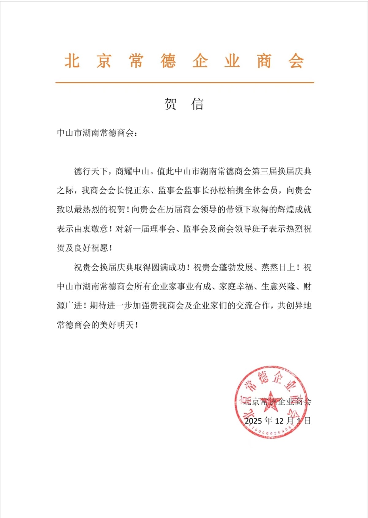 2025年12月16日下午,北京常德企业商会监事长孙松柏应邀参加中山市湖南常德商会第三届理监事会就职典礼暨常德投资环境推介会,北京常德企业商会热烈祝贺本次庆典活动取得圆满成功!