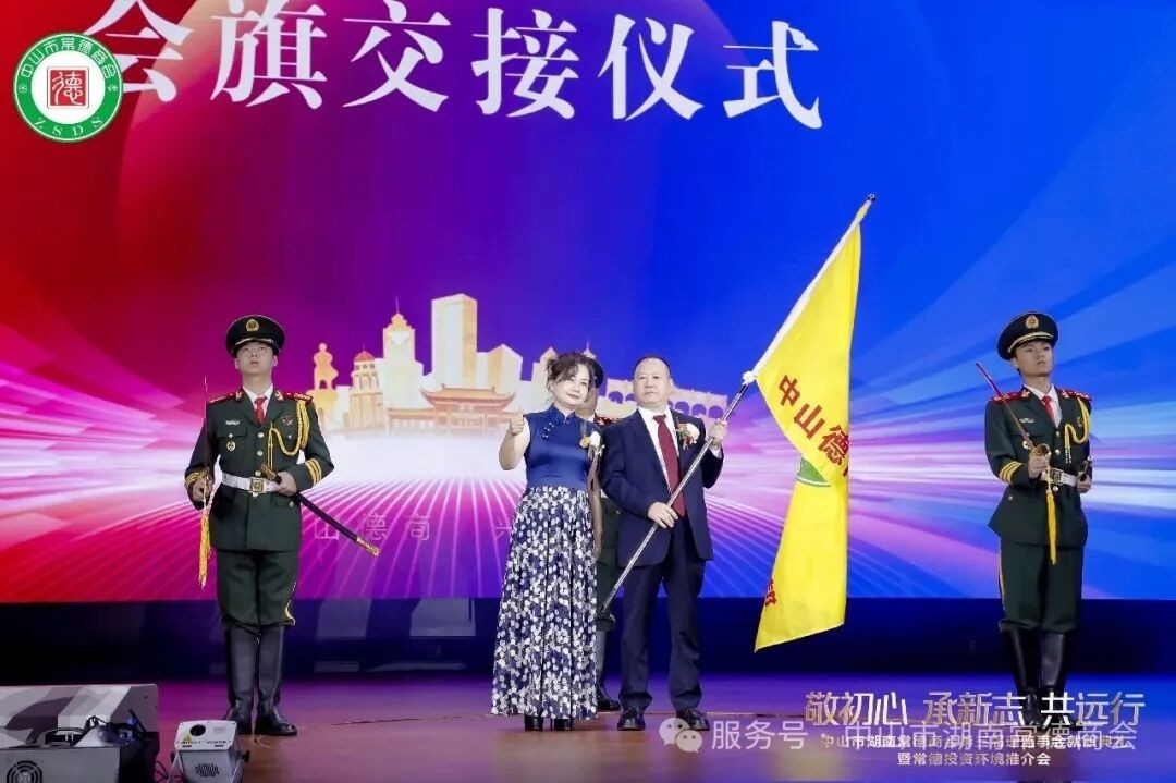 随后,就职典礼的庄重仪式正式开启。仪仗队迈着铿锵步伐,护卫国旗、会旗依次入场,全场肃立,国歌奏响。激昂的旋律中,家国情怀与商会使命同频共振。万众瞩目之下,第二届会长李芳杰女士将承载着300余家会员企业期盼与信任的会旗,郑重交予第三届会长陈玉先生。这一递一接,是初心的赓续,是责任的传承,更是新征程的序章。陈玉会长挥动会旗,宣告中山常德商会发展新篇章正式开启。