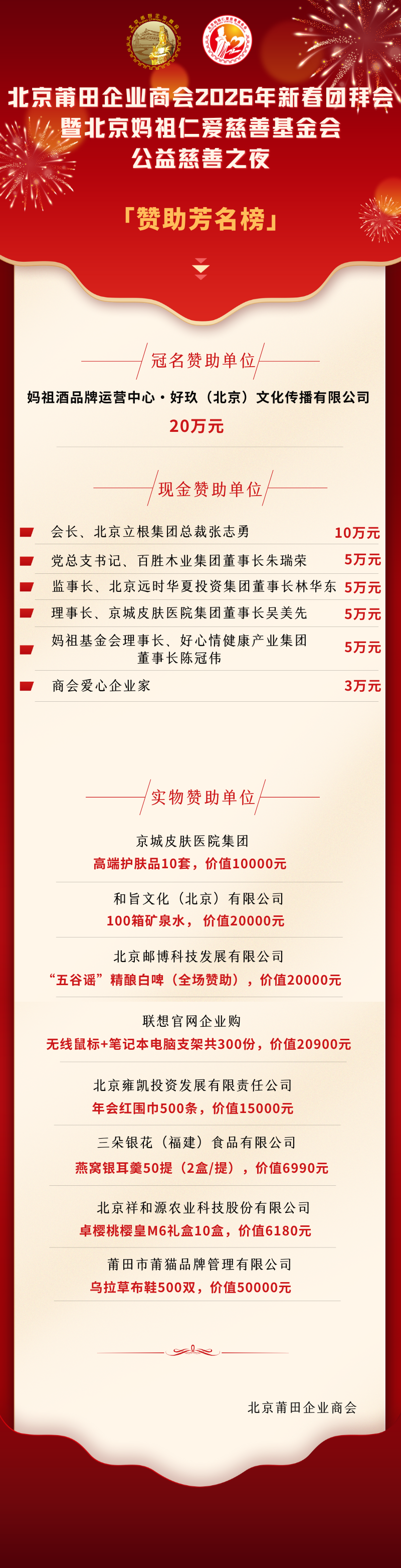 赞助芳名榜(一)丨北京莆田企业商会2026年新春团拜会暨北京妈祖仁爱慈善基金会公益慈善之夜