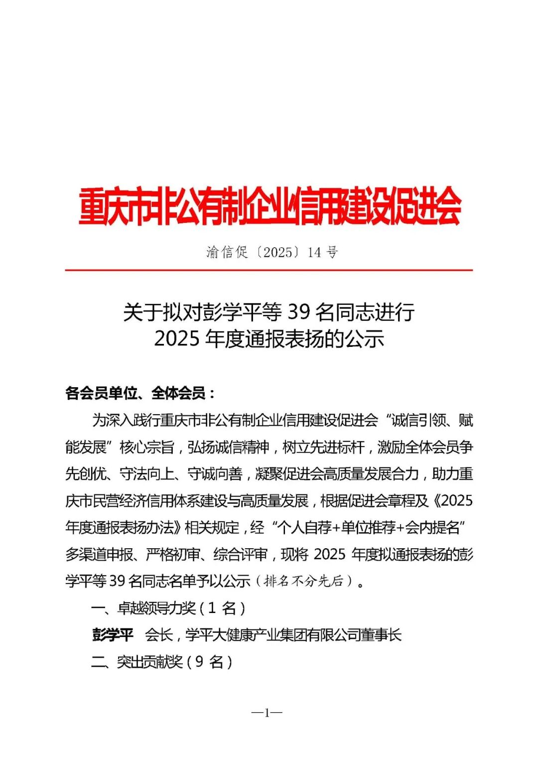 关于拟对彭学平等39名同志进行2025年度通报表扬的公示