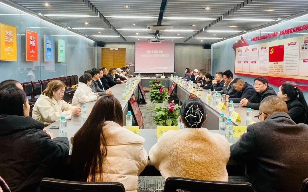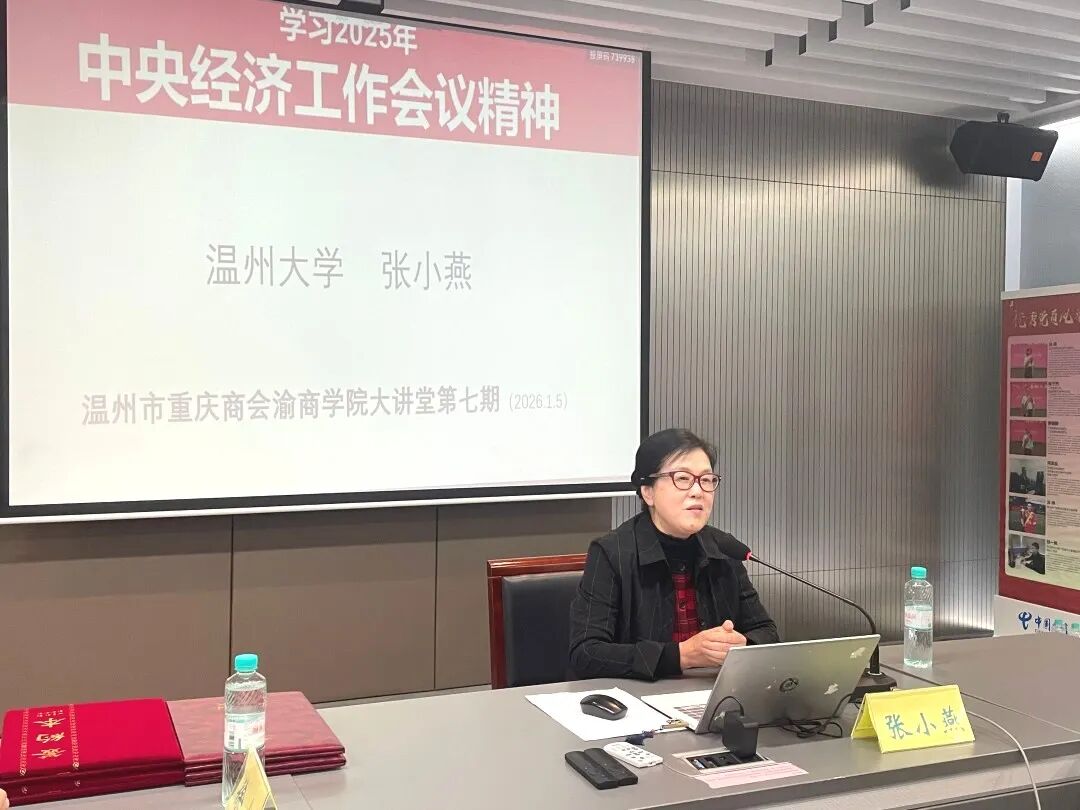 参访结束后,进入温州市重庆商会渝商学院大讲堂第七期专题培训时间。本次培训邀请温州大学马克思主义学院教授、温州市决策咨询委员会委员张小燕授课,张小燕教授从会议背景到会议内容,密切结合2026年经济工作“稳中求进 提质增效”的政策取向,密切结合温州“十五五”规划的“一圈一极一中心”,密切结合温州市重庆商会“有家有爱有力量”的发展实践,分享2025中央经济工作会议精神的学习心得。