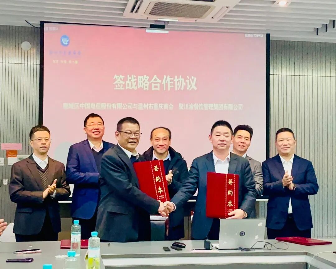 会议现场,中国电信温州公司与温州市重庆商会、聚川渝餐饮管理集团有限公司签署战略合作协议。