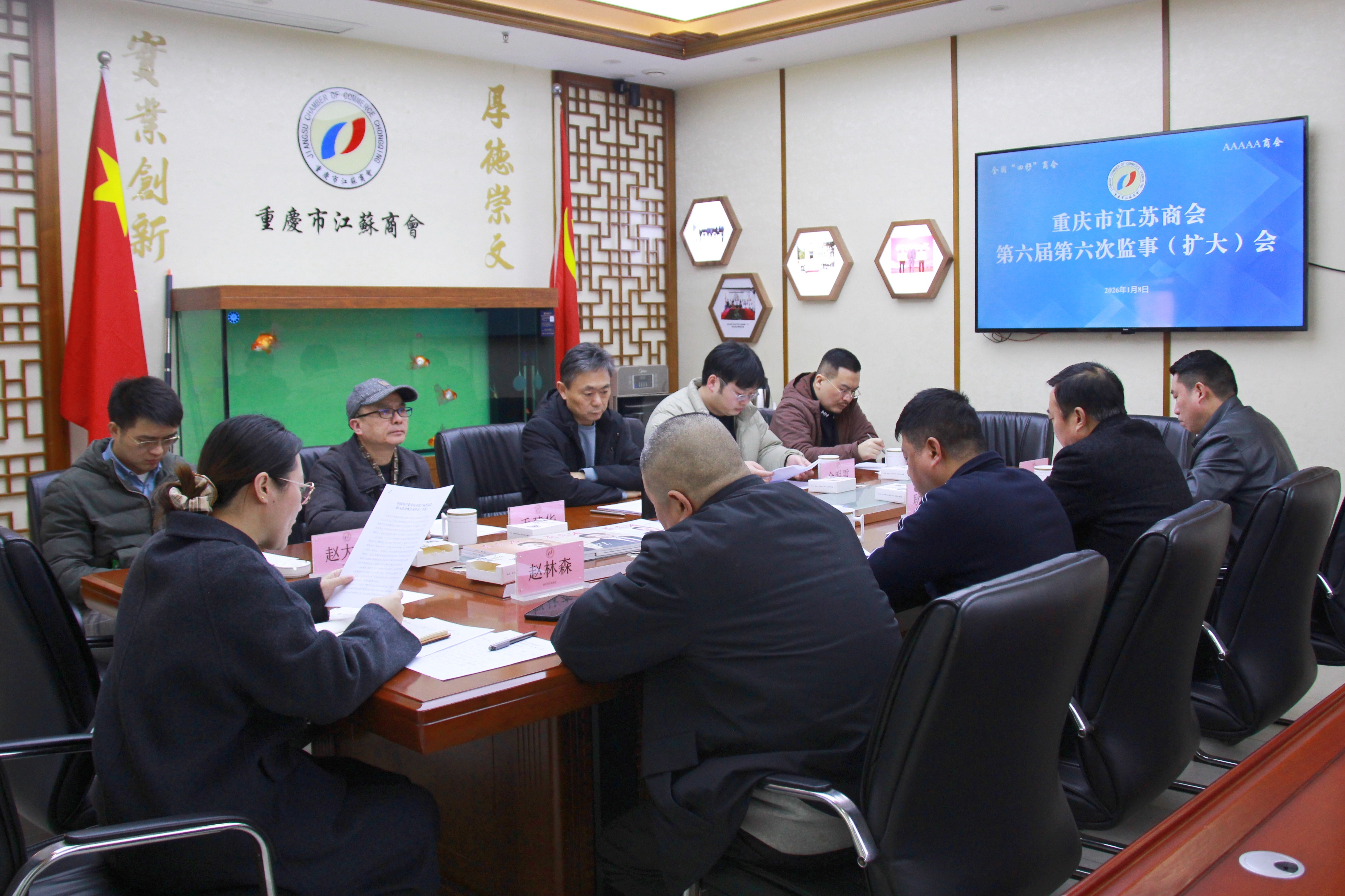 2026年1月8日下午,重庆市江苏商会第六届第六次监事(扩大)会议在商会办公室顺利召开。监事会成员参加会议,盐城分会监事长胥传春、徐州分会监事长王辉列席会议。会议由副监事长金明雪主持。