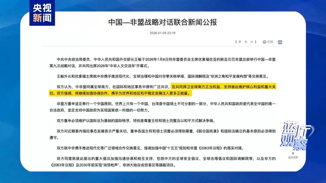 北京外国语大学国际关系学院教授宋微在接受《蓝厅观察》记者采访时表示,中国正在推动现代化发展,非洲也面临着抓住时代机遇,实现现代化转型的历史任务。中非通过加强产业协同,携手平等发展,共同迈向现代化。除了硬件领域的合作,王毅外长在访问非洲期间,还公布了一系列中非人文合作清单,未来不仅将开展多层次的人文合作,同时也关注非洲青年最根本的发展诉求。