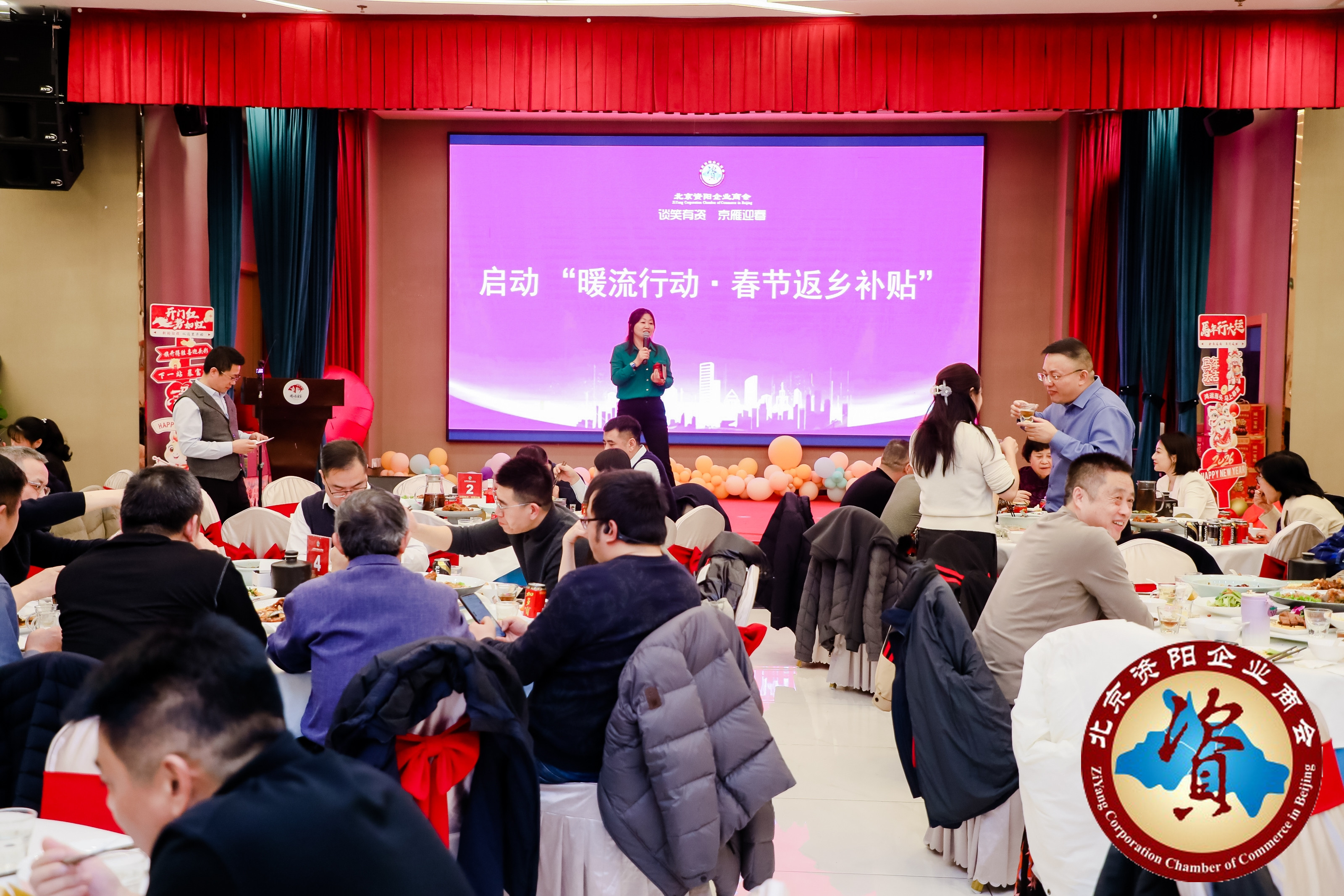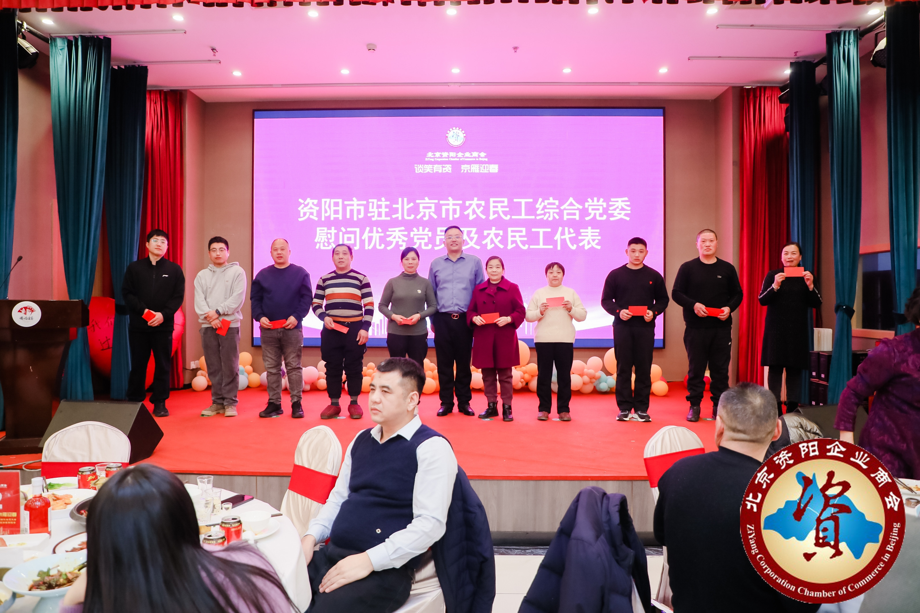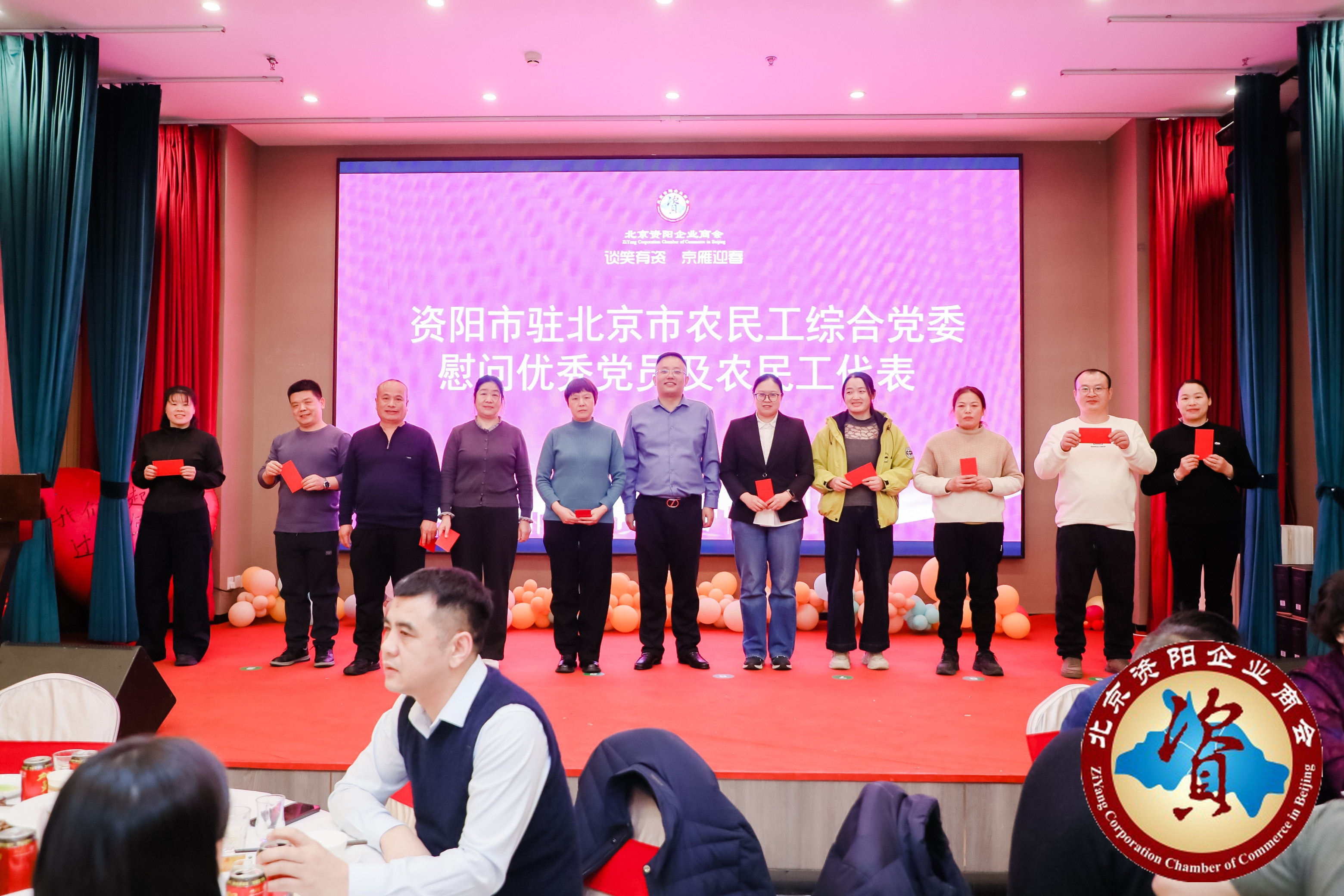 慰问环节暖意浓情,先是由资阳市就业创业促进中心四级调研员马长安、商会会长朱勇上台,为25名农民工代表发放慰问金,送上家乡的新春祝福;随后资阳市驻北京市农民工综合党委开展专项慰问,分三批次为雁江、安岳、乐至籍优秀党员及农民工代表发放慰问金,徐颖书记登台颁奖致意,以榜样力量凝聚奋进共识。为助力乡友平安返乡,活动特别启动“暖流行动·春节返乡补贴”专项举措,由代生燕同志详细解读补贴规则,为返乡乡友减轻出行负担,让归途满溢温情,尽显商会“娘家人”的贴心担当。全体嘉宾移步指定位置拍摄集体大合影,定格这份团圆喜悦与桑梓情深。