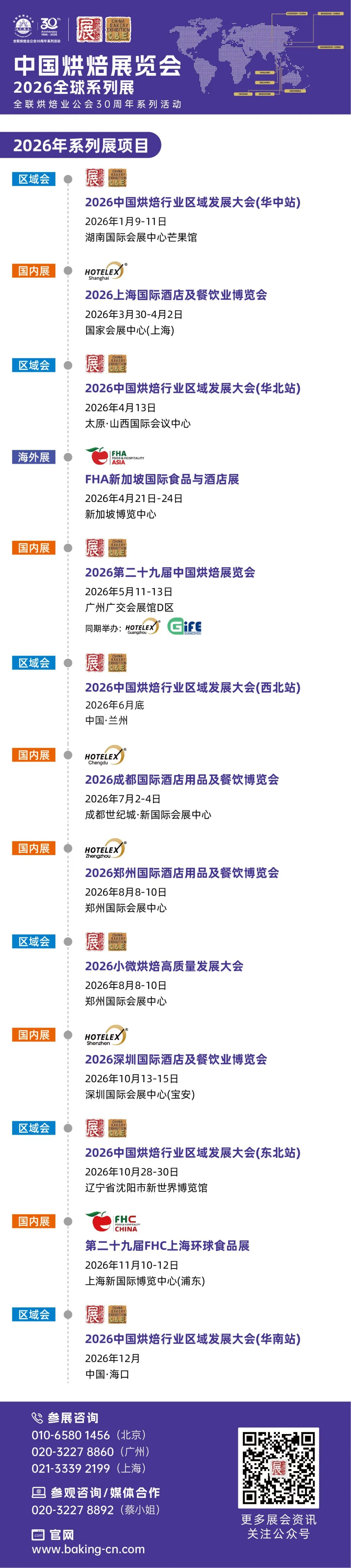 2026年正值中国烘焙行业高质量发展30周年,作为行业开年首场“烘焙+”盛会,本届展会将同期举办“中国烘焙高质量发展30周年庆典”系列活动,全面展示中国烘焙行业三十年辉煌成就与创新突破。