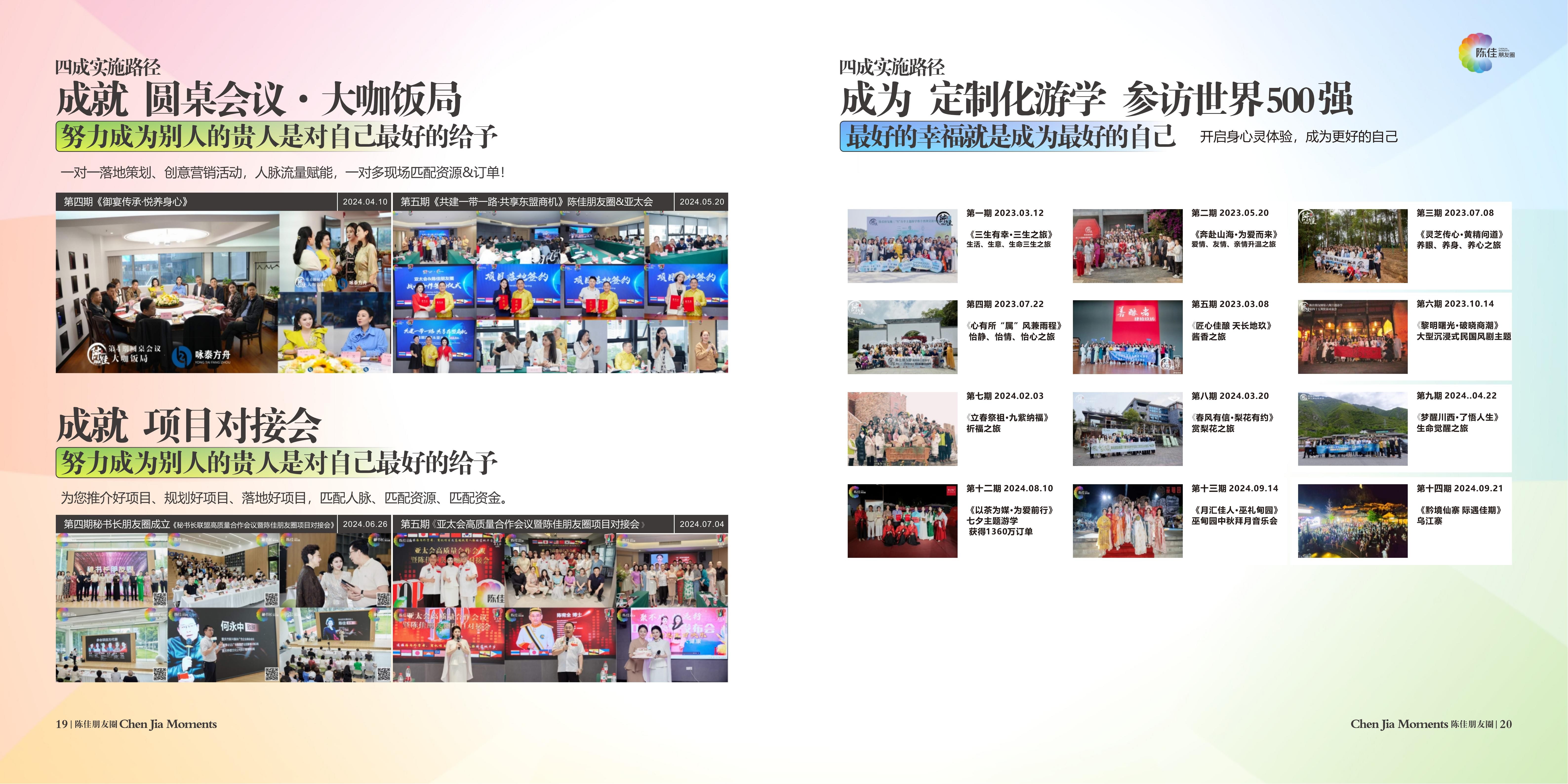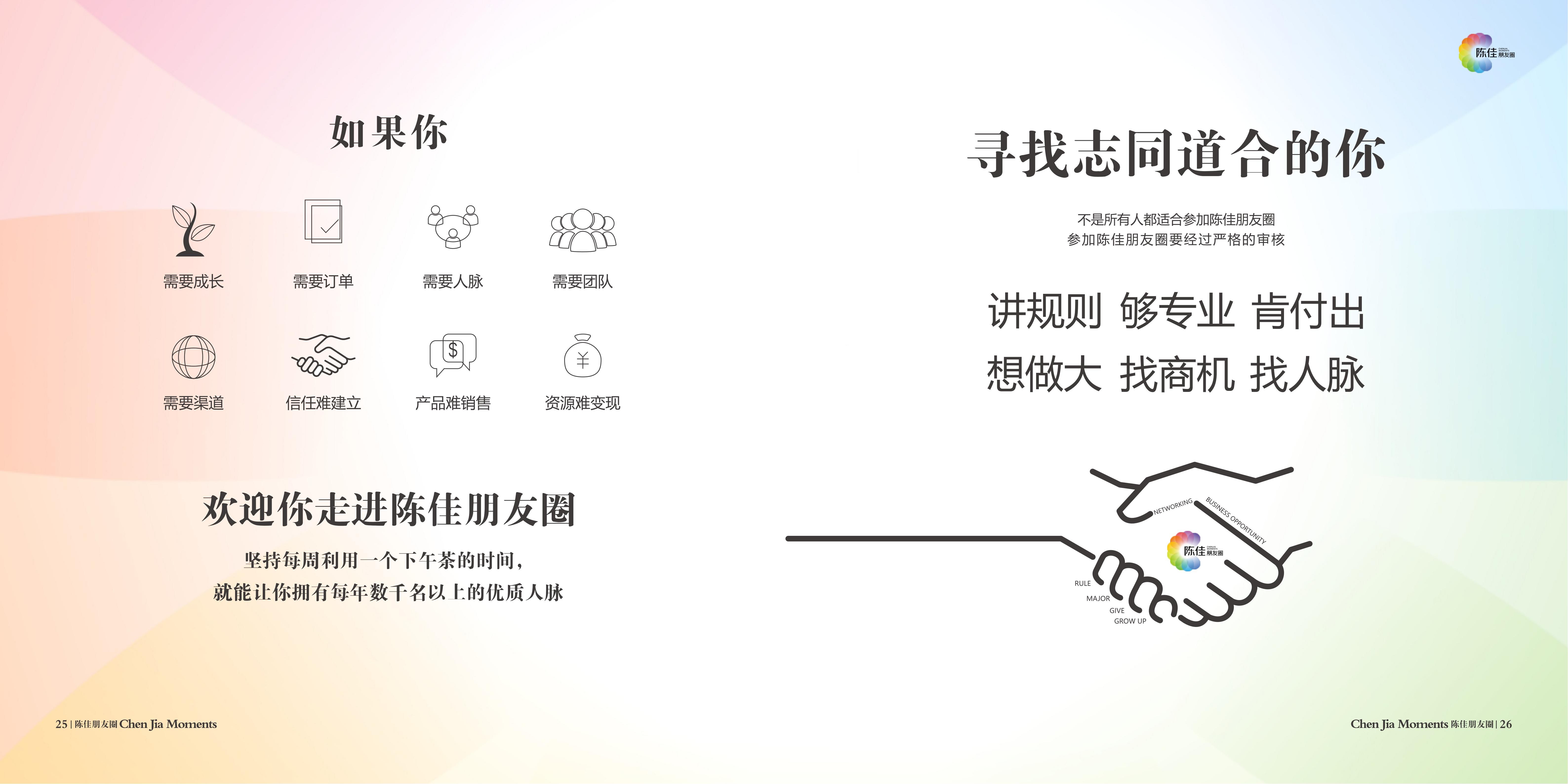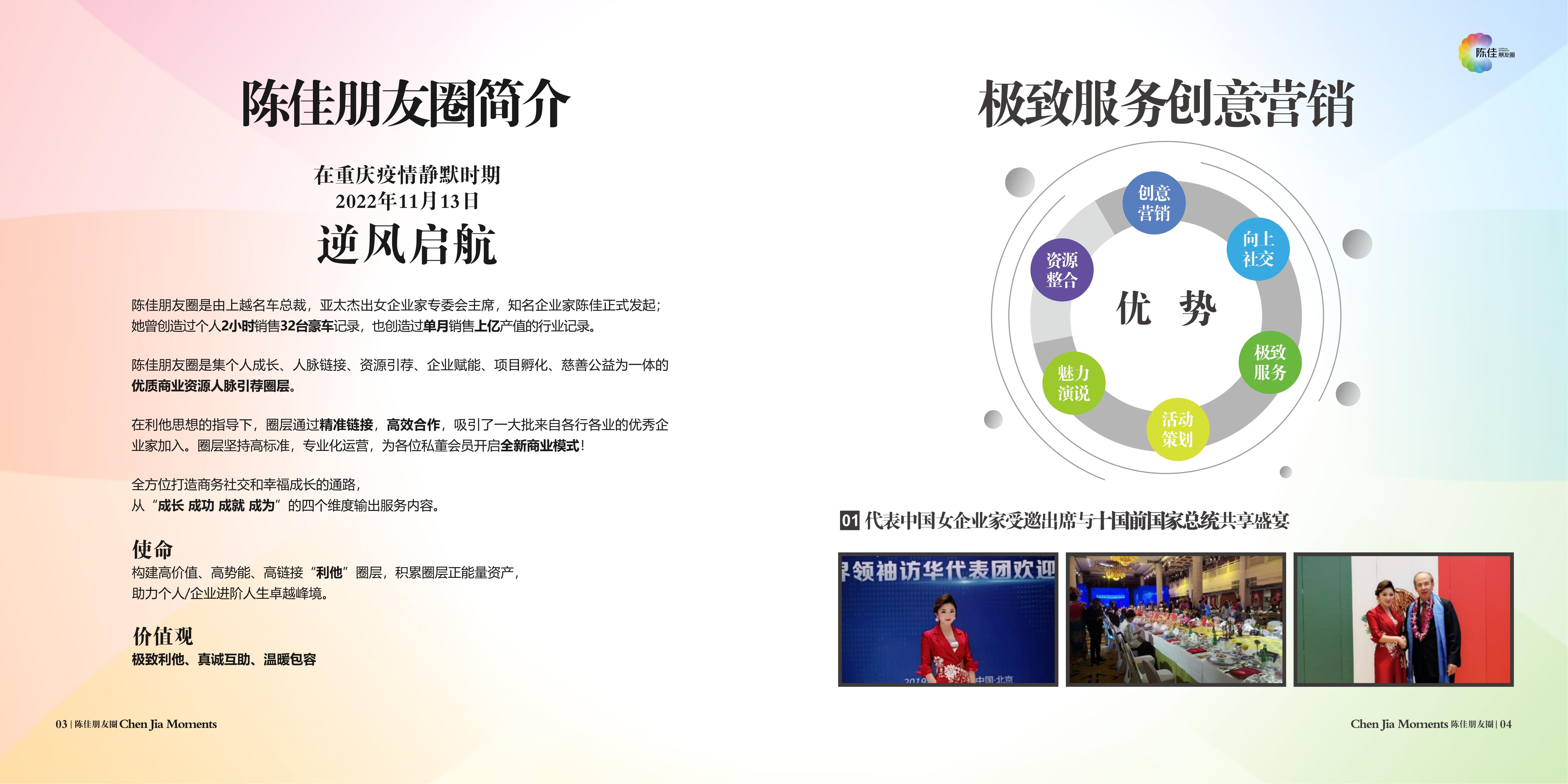 陈佳朋友圈是集个人成长、人脉链接、资源引荐、企业赋能、项目孵化、慈善公益为一体的优质商业资源人脉引荐圈层。