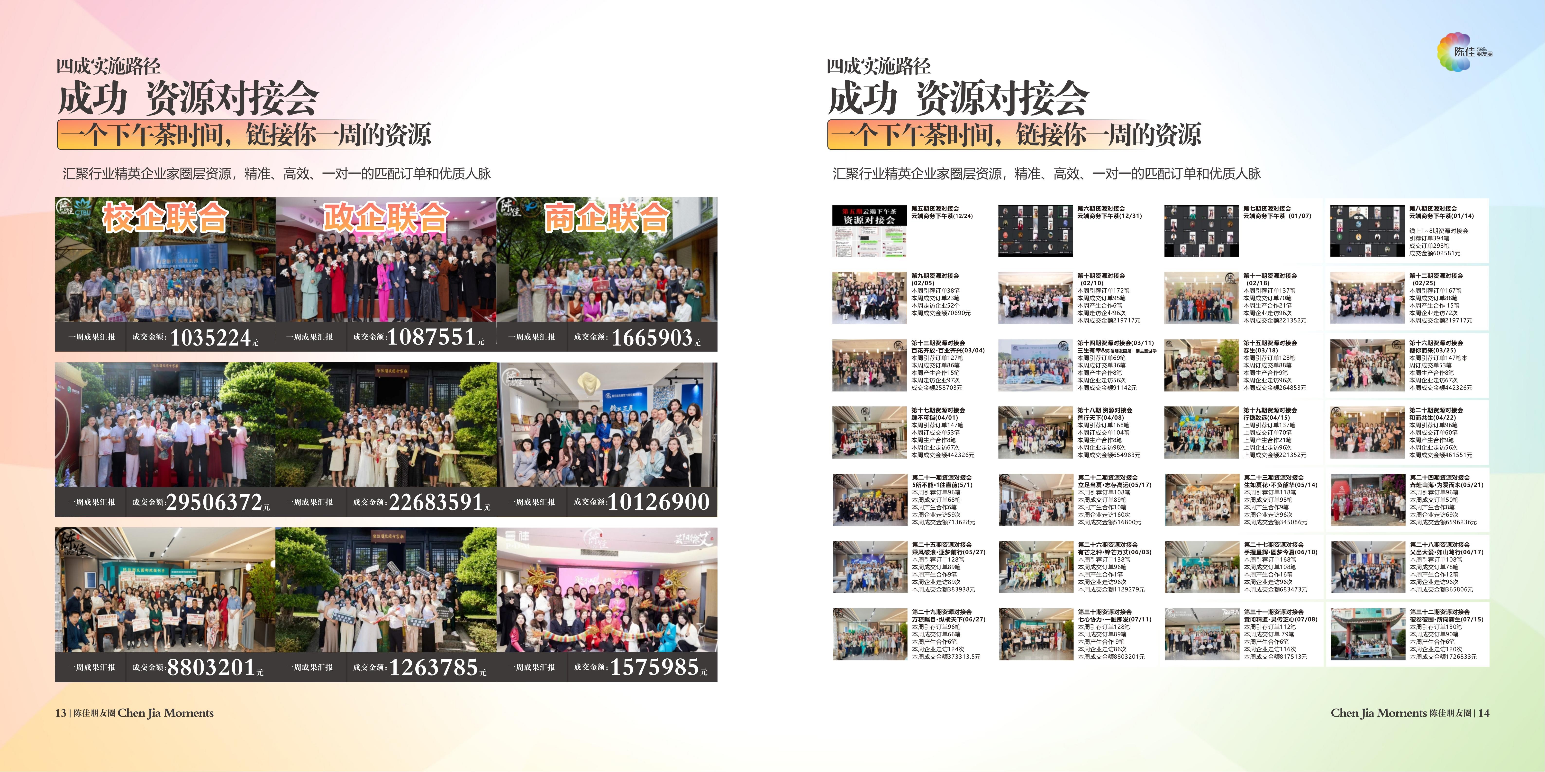 陈佳朋友圈截止今日已成立超1000天,已举办近1000场活动,累计服务线下30000余名企业家,私董成员达10000余人,成功引荐了22789笔订单,助力佳人们拿到336846324元订单!而陈佳朋友圈践行利他的方式,没有抽取任何佣金。
