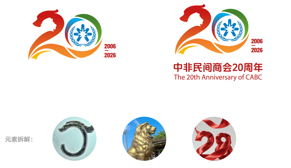 灵感来源与元素解析:本方案以“龙狮共舞”为核心意象——龙象征中国力量与智慧,狮代表非洲的活力与尊严,二者通过剪影艺术与负空间手法融合为数字“2”。三色舞动丝带交织成“0”,环抱商会标识,丝带色彩寓意热情、希望与共生。设计元素汲取自素有“中华第一龙”之称的红山文化玉龙,狮取材于非洲有关国家独立广场上的雄狮雕像,彰显历史底蕴与文化共鸣。象征意义:龙狮共舞,既体现中非以团结、勇气与坚韧携手同行,又象征双方在现代化征程中相互成就。丝带圆形环绕,寓意合作融通、民心相通,展现商会作为纽带,持续推动中非关系迈向更紧密、更繁荣的未来。灵感来源与元素解析:本方案以“丝路共舞”为视觉语言,飘逸蜿蜒的丝带自然勾勒出“20”字样,并环抱商会标识。丝带设计汲取“一带一路”倡议精神,流畅曲线象征中非合作共舞,友谊跨越山海。象征意义:丝带是互联互通的纽带,象征着联结与共舞,喻示广大会员在共建“一带一路”中非合作中携手同行、共建共享的美好愿景。丝带富有动感与韵律,亦传递出面向未来的轻盈姿态——中非合作将续写互利共赢新篇章,铸就高质量、可持续的发展。灵感来源与元素解析:本方案以“无限符号♾️”为灵感根基,通过两条逐渐接近、交织的线条,形成“你中有我、我中有你”的共生结构,抽象表达出中非合作交汇融合的趋势,最终构成“♾️”形态,环抱商会标识。象征意义:“♾️”象征中非友好交往与合作历经70年沉淀,已突破地域与边界,迈向“无限可能”的高质量发展新阶段。标识亦传递“你中有我、我中有你”的合作哲学,是对中非合作可持续发展与人类命运共同体理念的生动写照,彰显商会致力于构建超越国界、互利共赢的合作生态,寓意中非携手,未来合作之路充满无限可能与持久动力。