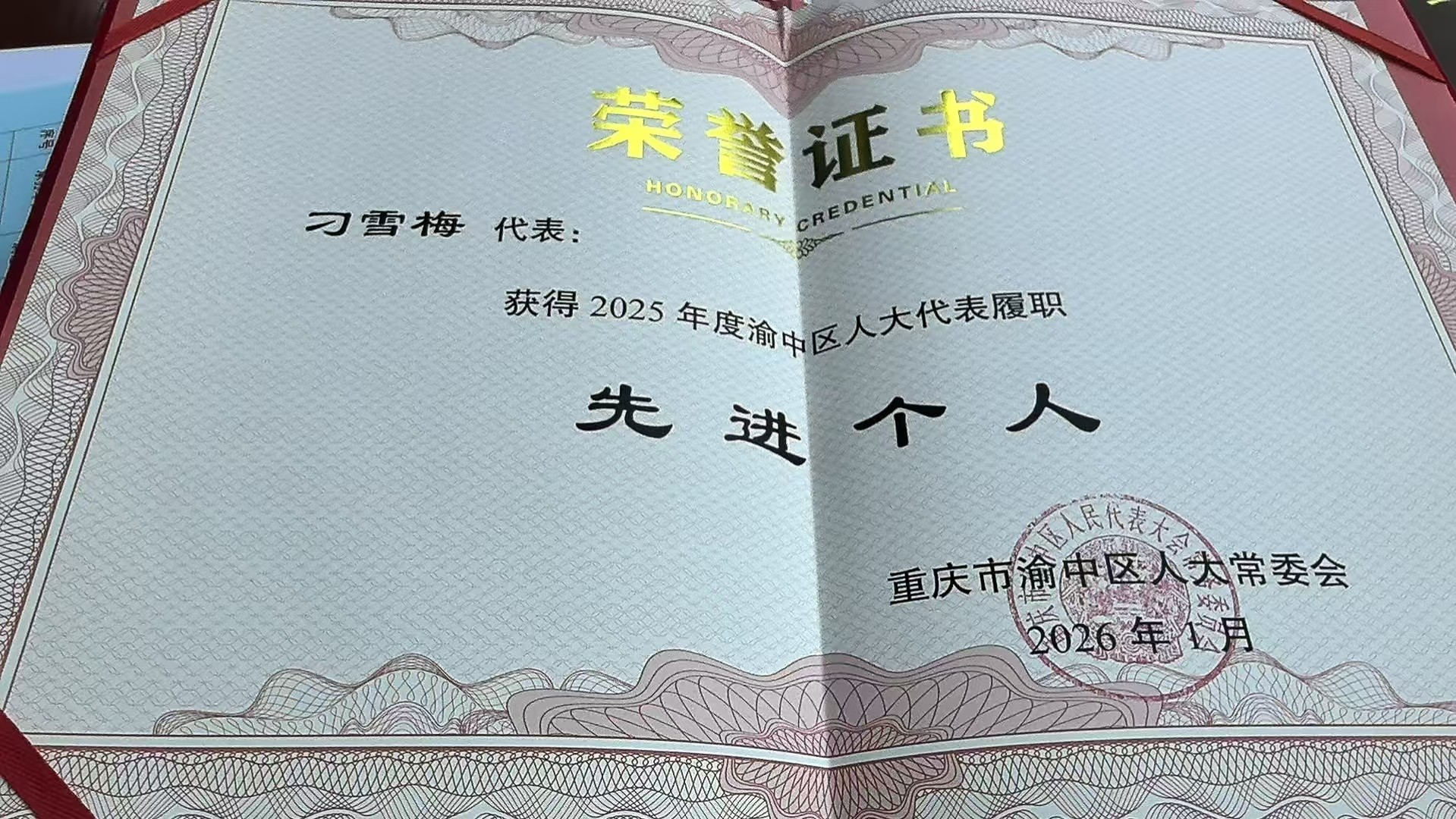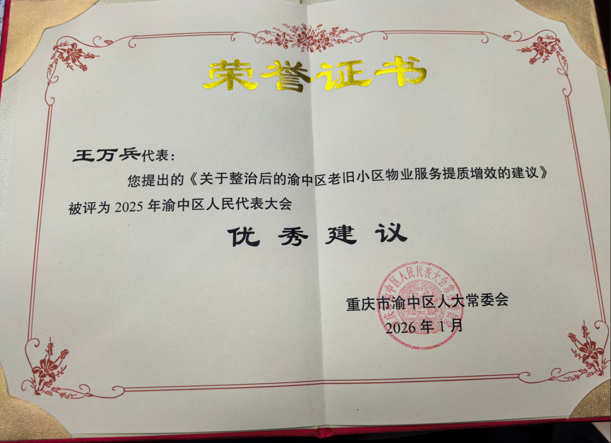 今天(1月23日)上午,在渝中区正在召开的两会上,重庆市四川商会常务副会长、重庆大地生态环境科技集团股份有限公司总裁刁雪梅,副会长、重庆市祥佳物业管理有限公司董事长王万兵,双双获得表彰。其中刁雪梅获评2025年度渝中区人大代表履职先进个人,王万兵提出的《关于整治后的渝中区老旧小区物业服务提质增效的建议》被评为2025年渝中区人民代表大会优秀建议。