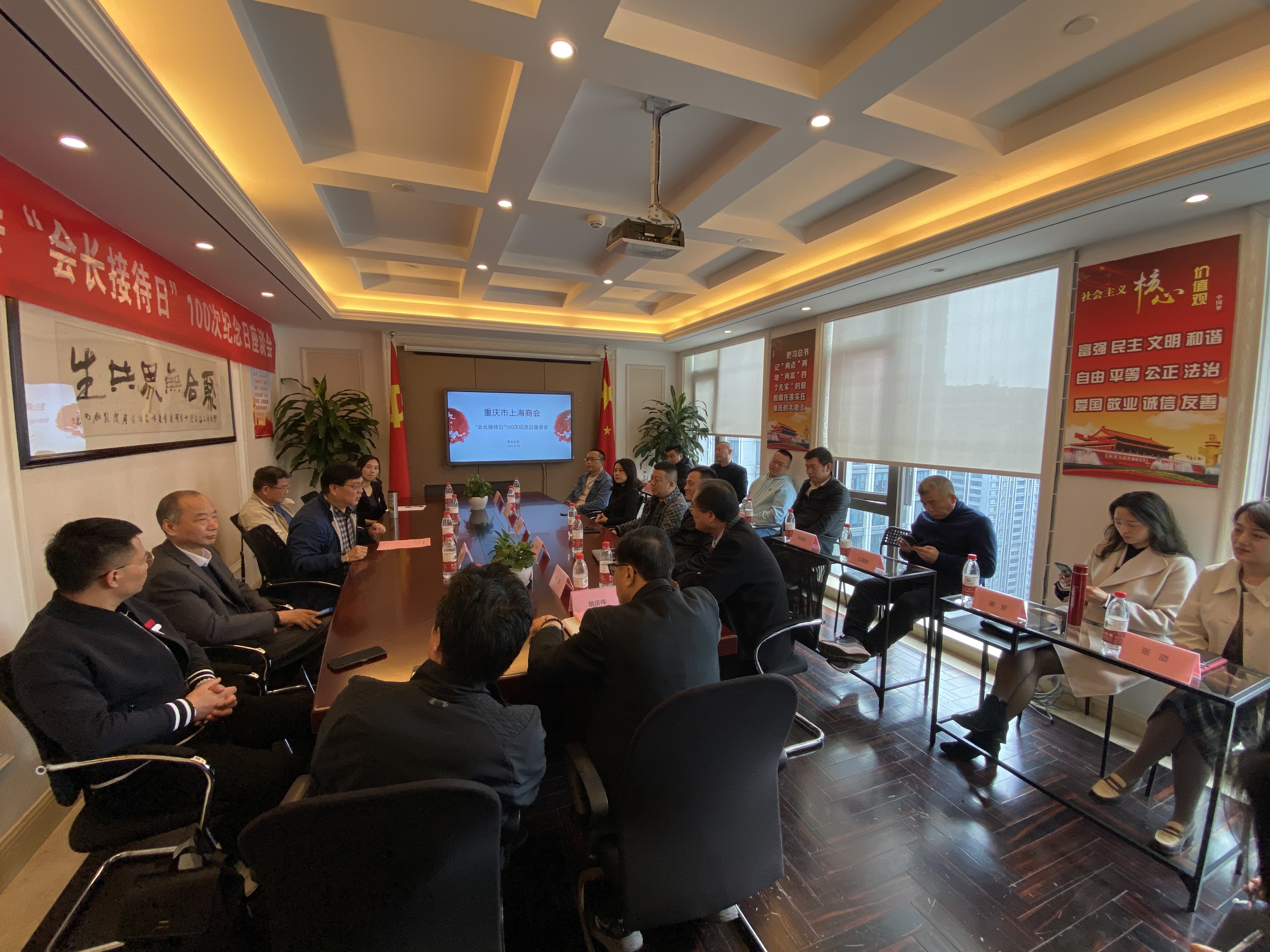 2021年3月12日下午两点,重庆市上海商会“第100次会长接待日”纪念座谈会在商会总部会议室圆满举办。名誉会长詹绍俊,会长韦根,监事长王维勇,常务副会长伍沛臻,秘书长姚庆伟,副会长沈时清、邱晓峰,理事徐敏、金永华、邱勇、龙均、姚瑞平以及部分会员企业家共计22人参加了座谈会。纪念活动由商会党委书记、会长韦根主持。