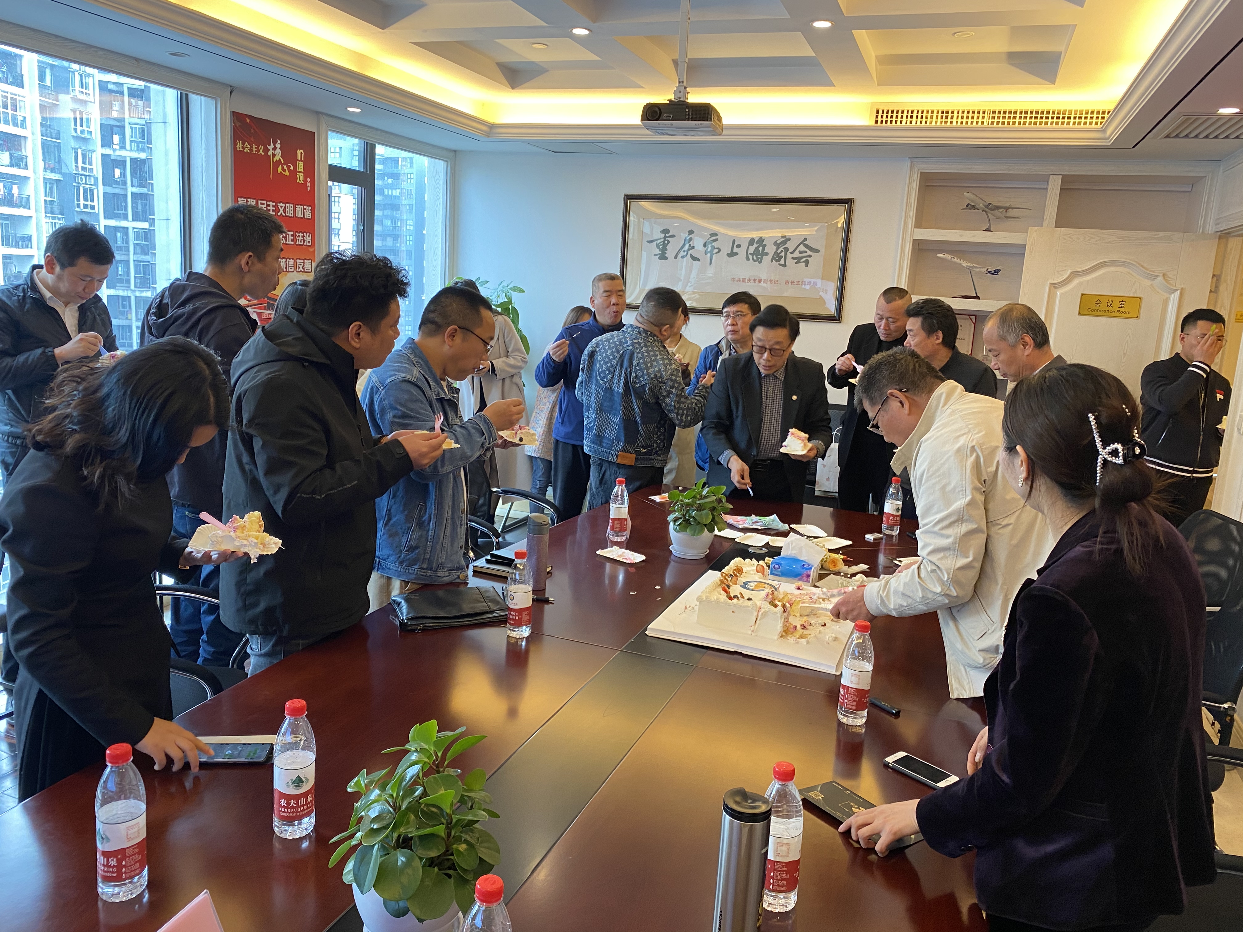 最后,与会者共同分享了“第100次会长接待日”的蛋糕,共同祝福商会重庆市上海商会“第100次会长接待日”“生日快乐”,祝愿重庆市上海商会的明天更加美好!