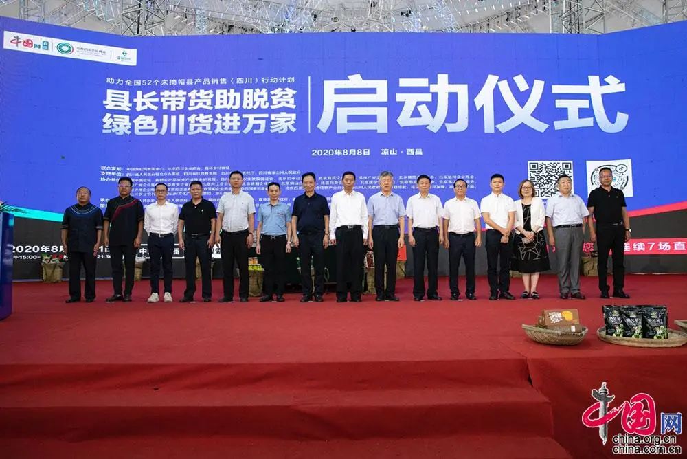 8月8日下午,“县长带货助脱贫·绿色川货进万家”县长直播带货启动仪式在西昌市火把广场举行,图为现场嘉宾在启动仪式上合影。中国网记者 董宁摄影