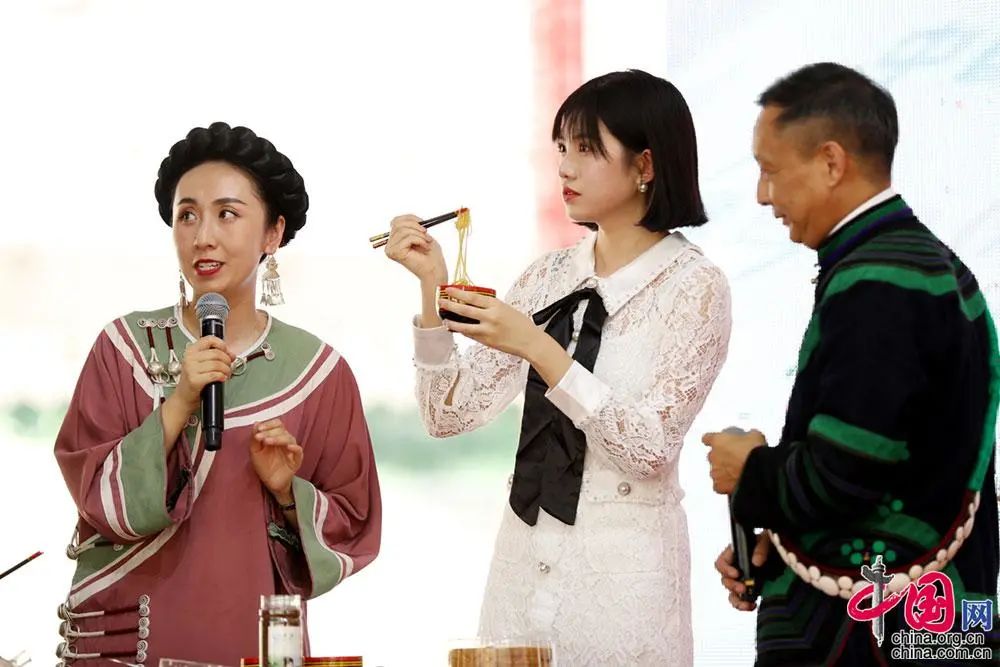 8月10日下午, “县长带货助脱贫·绿色川货进万家”县长直播带货活动凉山喜德县直播现场,主播现场品尝煮好的苦荞面条。中国网记者 董宁摄影