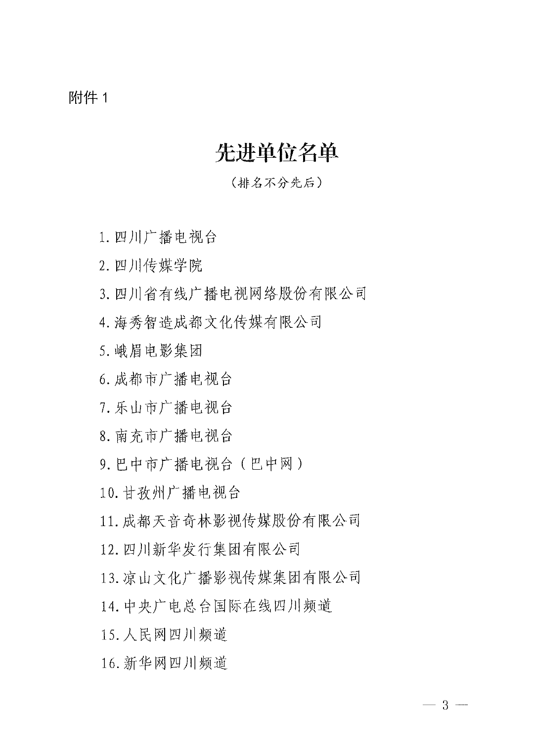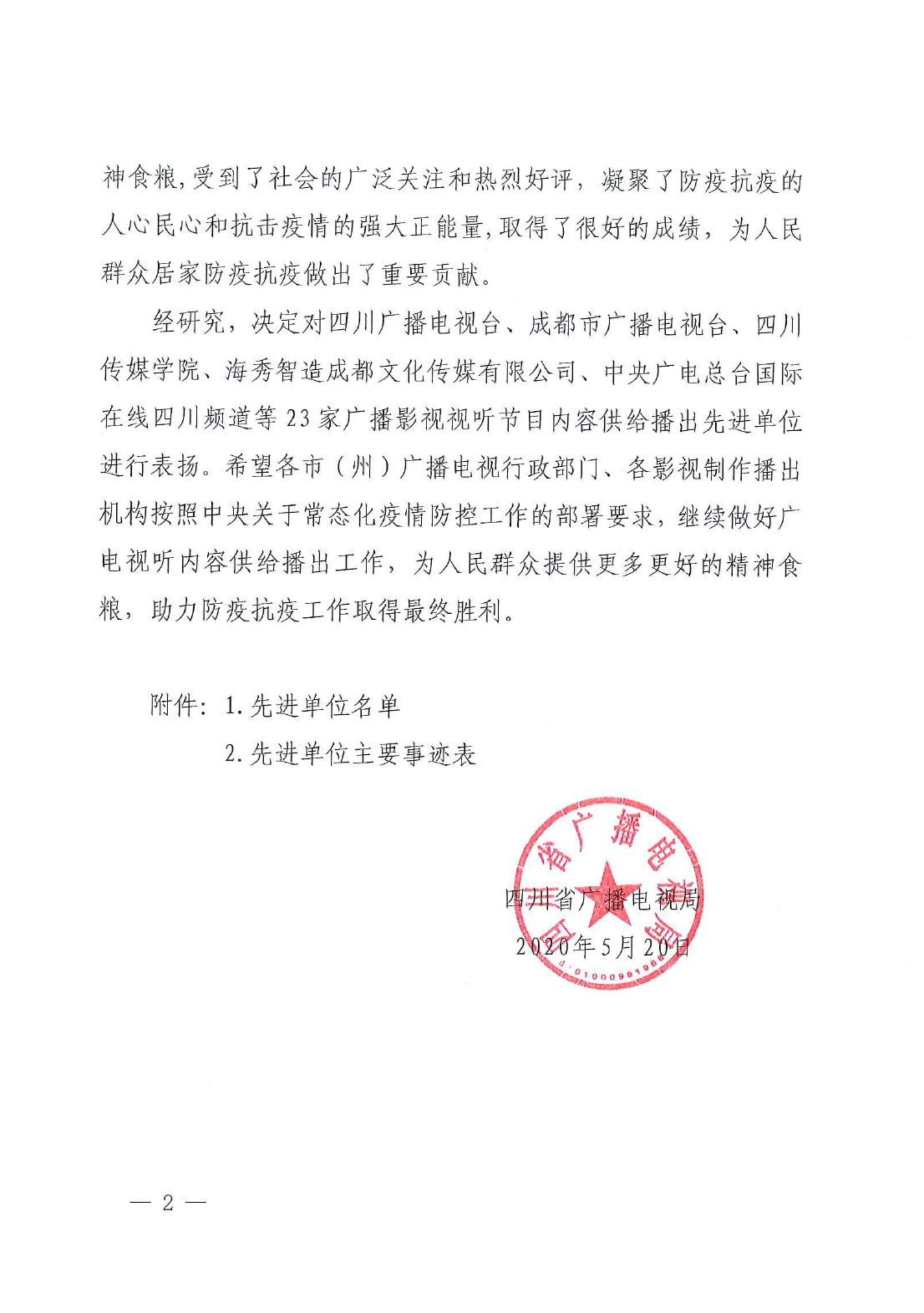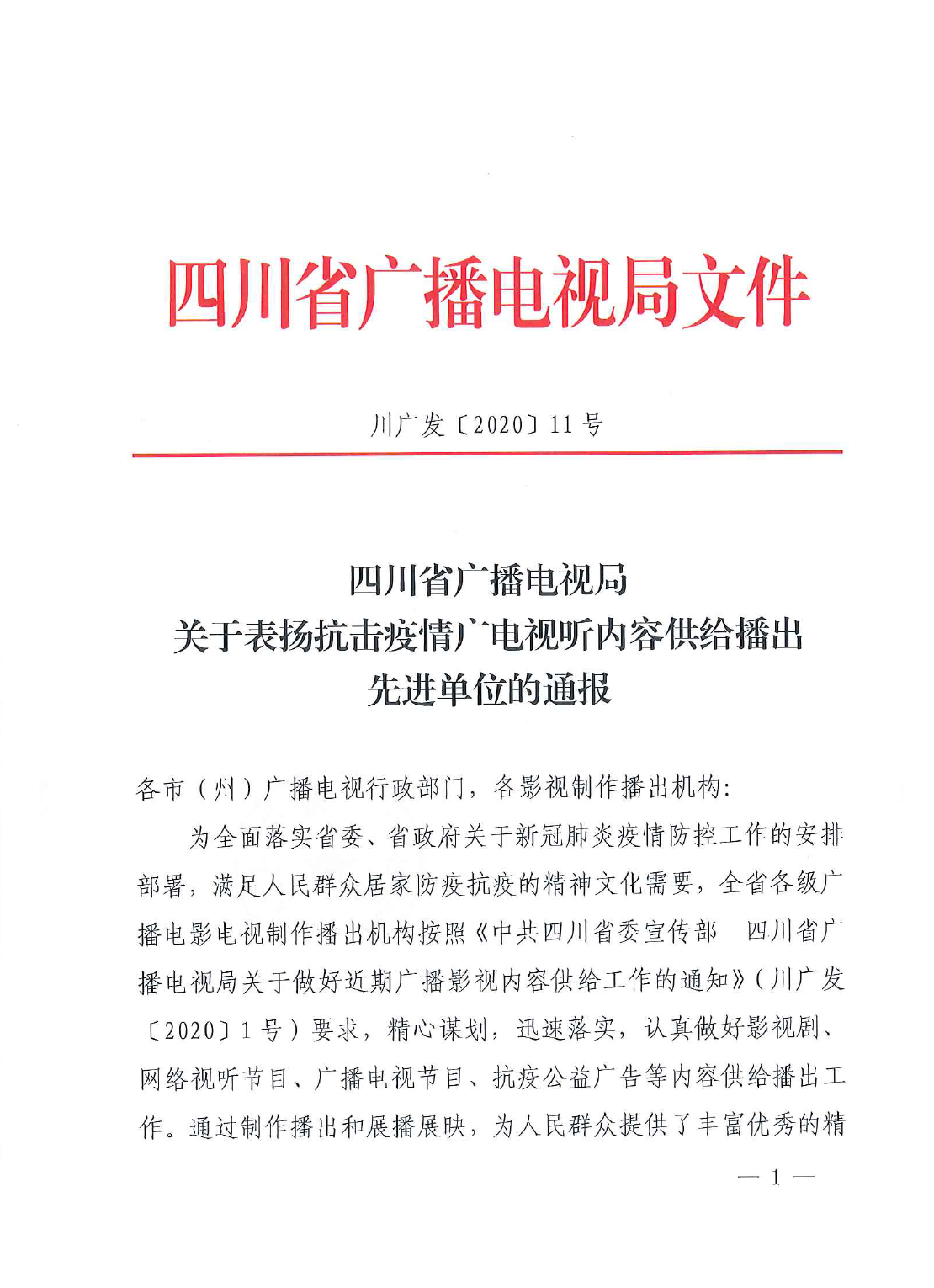 2020-05-29 为全面落实省委、省政府关于新冠肺炎疫情防控工作的安排部署,满足人民群众居家防疫抗疫的精神文化需要,全省各级广播电影电视制作播出机构按照《中共四川省委宣传部四川省广播电视局关于做好近期广播影视内容供给工作的通知》(川广发[2020] 1号)要求,精心谋划,迅速落实,认真做好影视剧、网络视听节目、广播电视节目、抗疫公益广告等内容供给播出工作。通过制作播出和展播展映,为人民群众提供了丰富优秀的精神食粮,受到了社会的广泛关注和热烈好评,凝聚了防疫抗疫的人心民心和抗击疫情的强大正能量,取得了很好的成绩,为人民群众居家防疫抗疫做出了重要贡献。 经四川省广播电视局研究决定,对四川传媒学院在内的23家广播影视视听节目内容供给播出先进单位进行表扬。