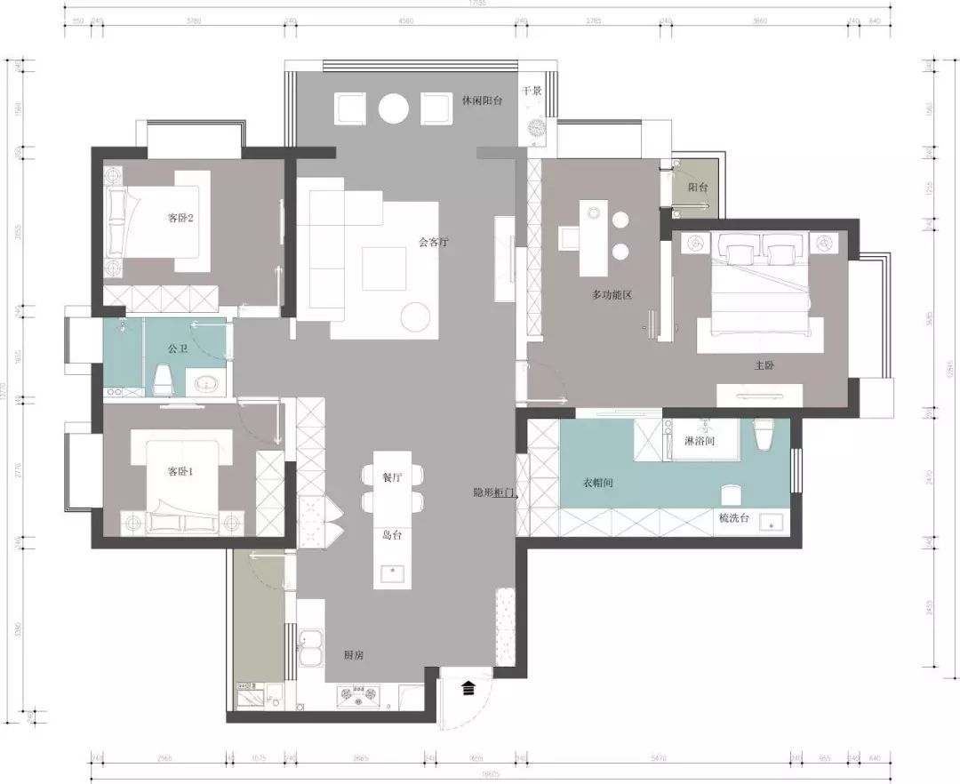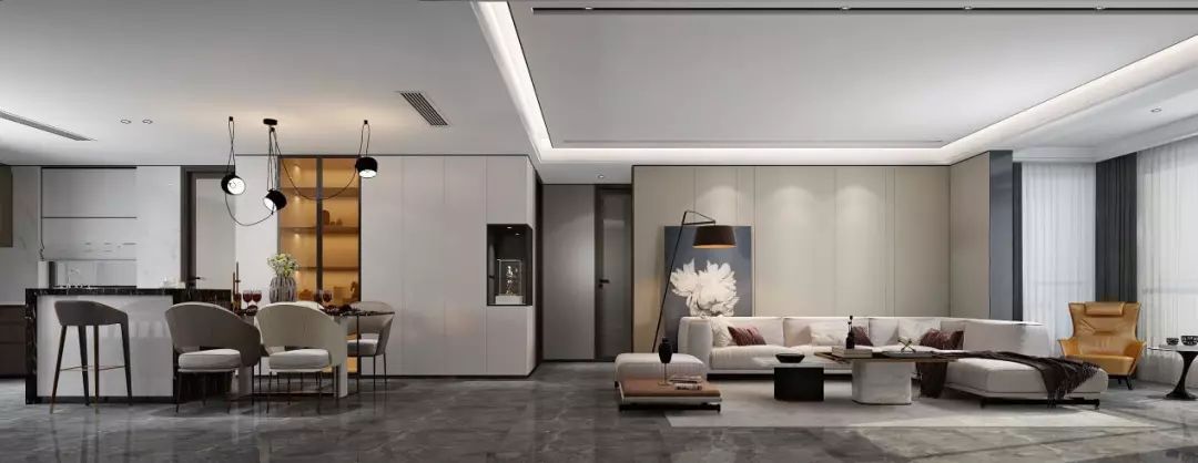此户型原本为四居室套房,结合业主独居的需求,设计师将房型改为三居室,主卧区域设计为套房形式,功能齐全,居住舒适,休闲空间将厨房改为开放式,整个休闲空间通透,餐桌与岛台相连,以便交友娱乐。