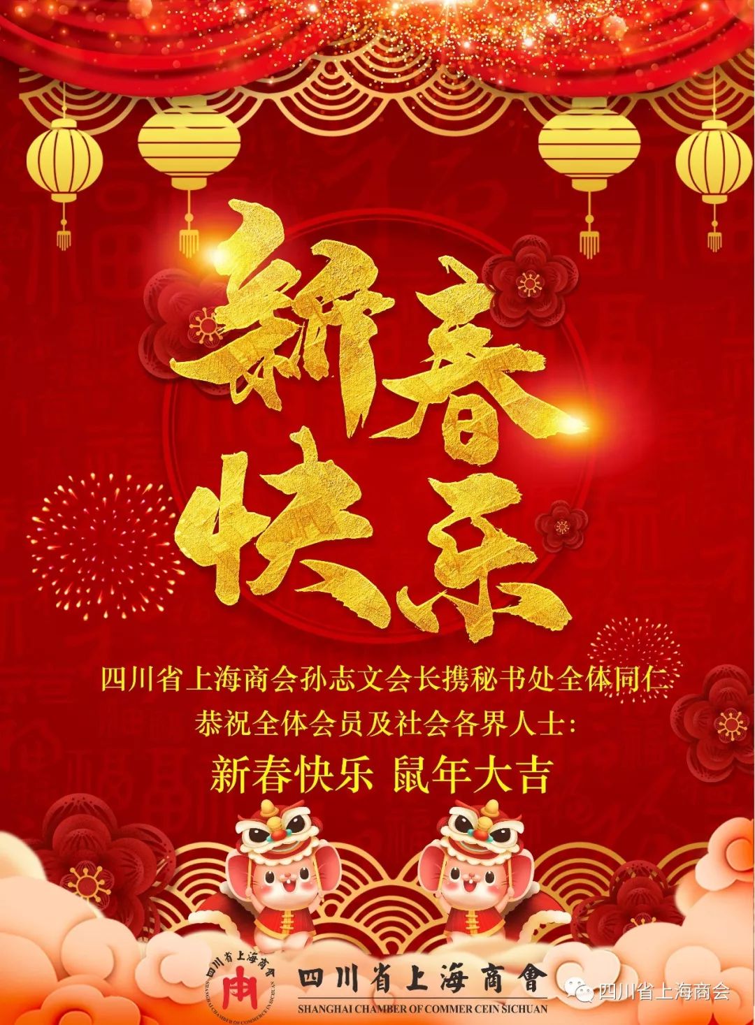 猪岁捷报频传,鼠年吉星高照!四川省上海商会会长孙志文携秘书处全体同仁向您及家人致以诚挚的问候和新春的祝福,感谢您对商会一如既然的支持与厚爱,祝愿大家鼠年大吉!阖家欢乐!万事如意!