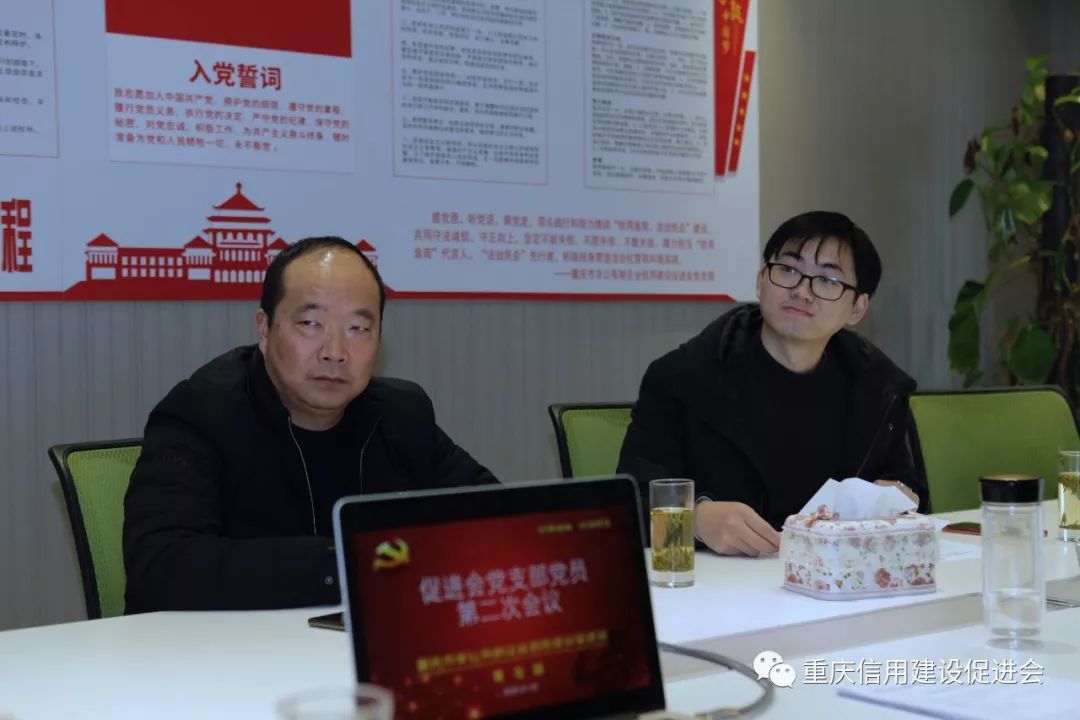 促进会党支部书记、执行副会长兼秘书长、重庆孺子牛文化传媒有限公司总经理蒋维胜以《听党话 跟党走 以扎实的党建助力“信用渝商”建设》为题,对促进会党支部2019年工作作总结,并表示促进会党支部将提高站位、务实创新,进一步加强和改进促进会党员和全体会员的思想政治工作,引导会员牢固树立“四个意识”,坚定“四个自信”,坚决做到“两个维护”,引领促进会坚持“政治办会”、“规范建会”、“诚信立会”、“开放强会”、“服务树会”,增强党员和会员对中国特色社会主义的信念、对党和政府的信任、对企业发展的信心、对社会的信誉更加坚定发展信心,提升依法治企意识,规范企业内部治理,自觉守法诚信经营,千方百计确保促进会工作方向正确,促进会正成长为“信用渝商”“信用重庆”建设中不可或缺的重要生力军。