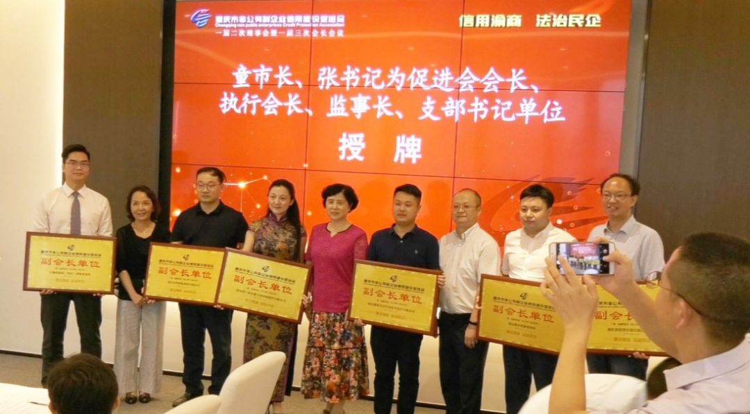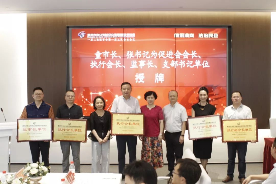 市政府原副市长,市工商联党组副书记、副主席张莉和党组成员、副主席王进为促进会执行会长、监事长、执行副会长单位授牌,执行会长、学平大健康产业集团有限公司董事长彭学平,执行会长、重庆美利信压铸有限责任公司总经理余亚军,执行会长、重庆菜香源餐饮文化有限公司董事长余斌,监事长、重庆俏业家装饰工程有限公司董事长唐维升,支部书记、执行副会长、重庆孺子牛文化传媒有限公司总经理蒋维胜分别接牌。