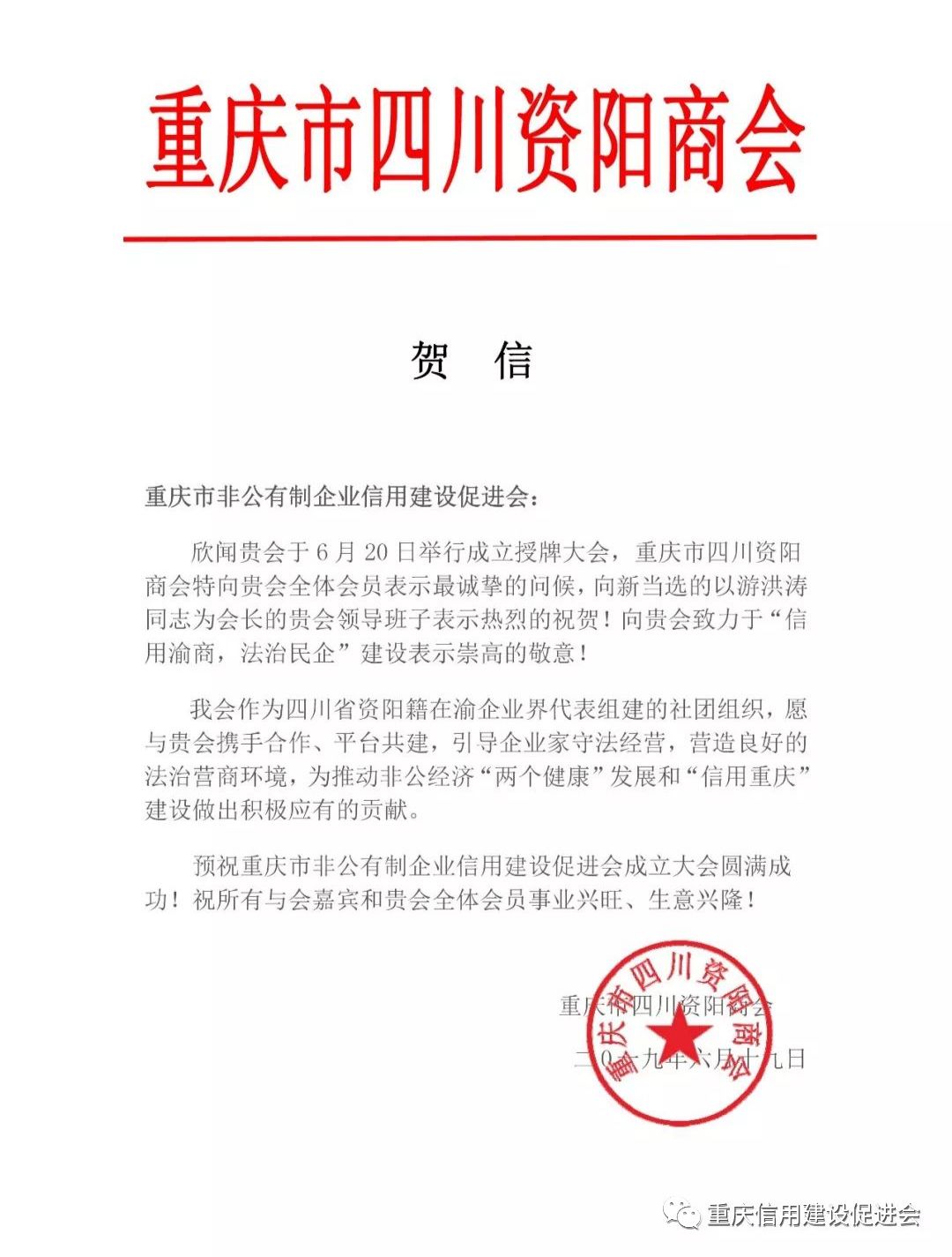 欣闻贵会于6月20日举行成立授牌大会,重庆市四川资阳商会特向贵会全体会员表示最诚挚的问候,向新当选的以游洪涛同志为会长的贵会领导班子表示热烈的祝贺!向贵会致力于“信用渝商,法治民企”建设表示崇高的敬意!