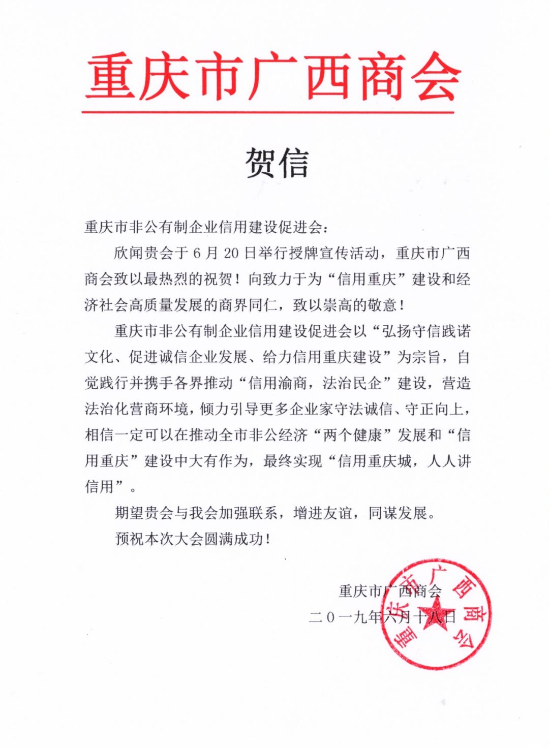 欣闻贵会于6月20日举行授牌宣传活动,重庆市广西商会致以最热烈的祝贺!向致力于为“信用重庆”建设和经济社会高质量发展的商界同仁,致以崇高的敬意!
