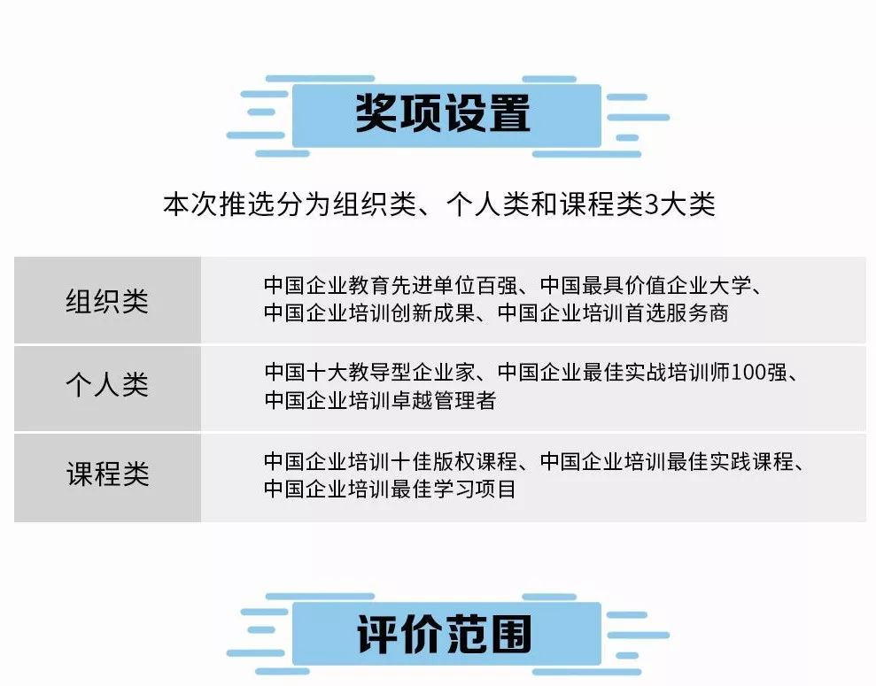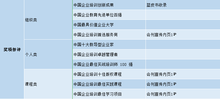 (六)参评费用:为树立行业标杆,推动中国企业培训的发展,参评不收取评审费用。